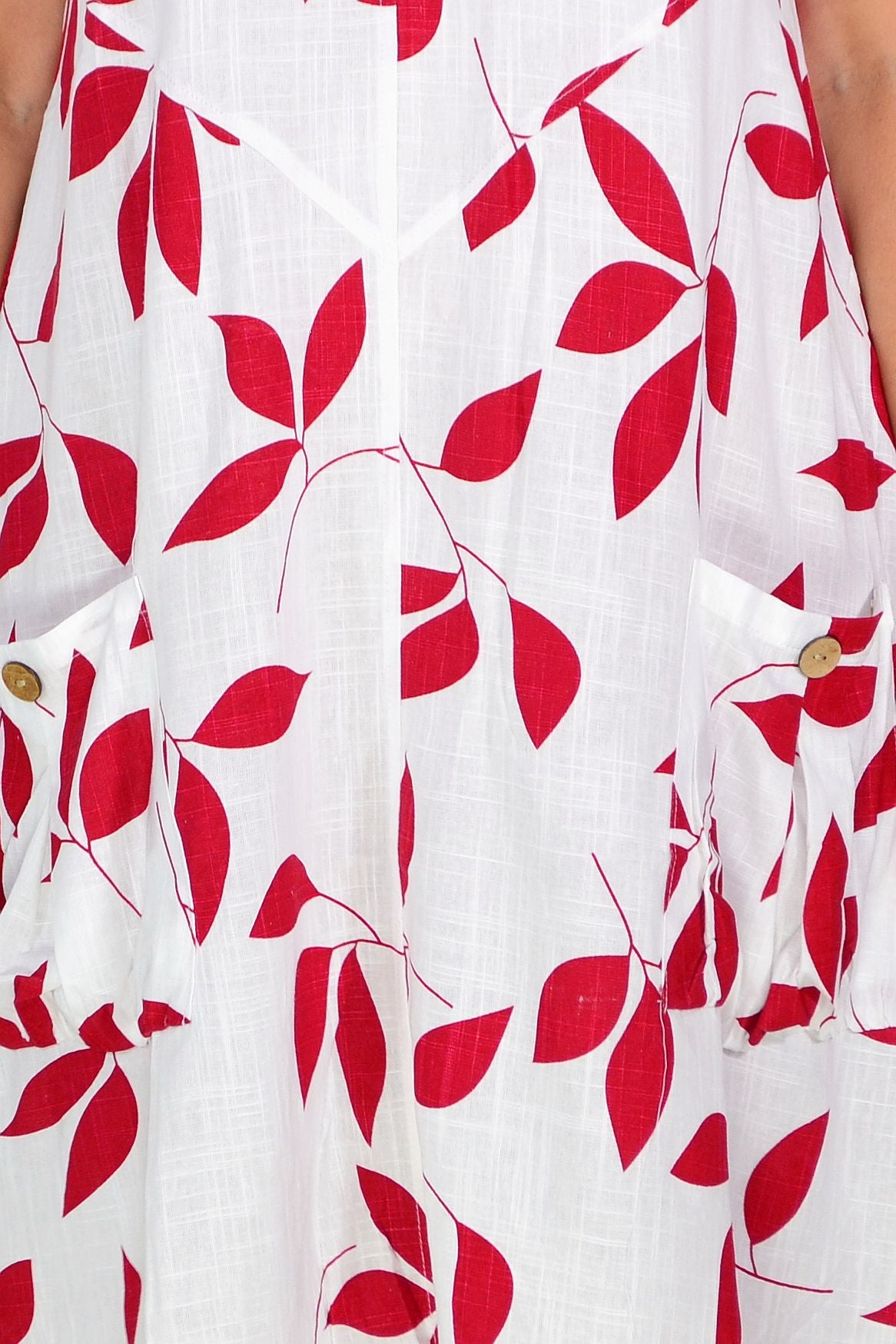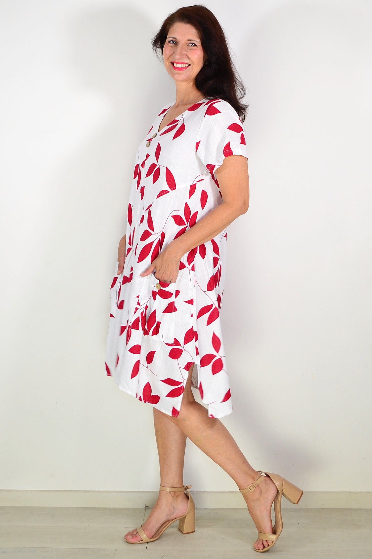 Regular price $69.99Embrace effortless elegance with this refined linen-cotton blend tunic dress. Crafted from a luxurious 65% linen and 35% cotton blend, the summer-weight fabric drapes beautifully in an A-line silhouette that flatters every figure. The crisp white background showcases delicate red petal detailing, while practical front pockets and side slits provide comfort and ease of movement. Short sleeves and a graceful V-neckline trimmed with coconut buttons complete the sophisticated design. Perfect for warm weather styling, this knee-length piece transitions seamlessly from casual to refined occasions.