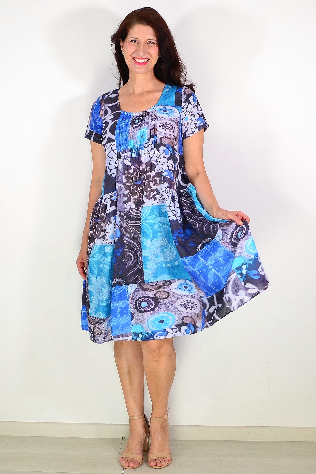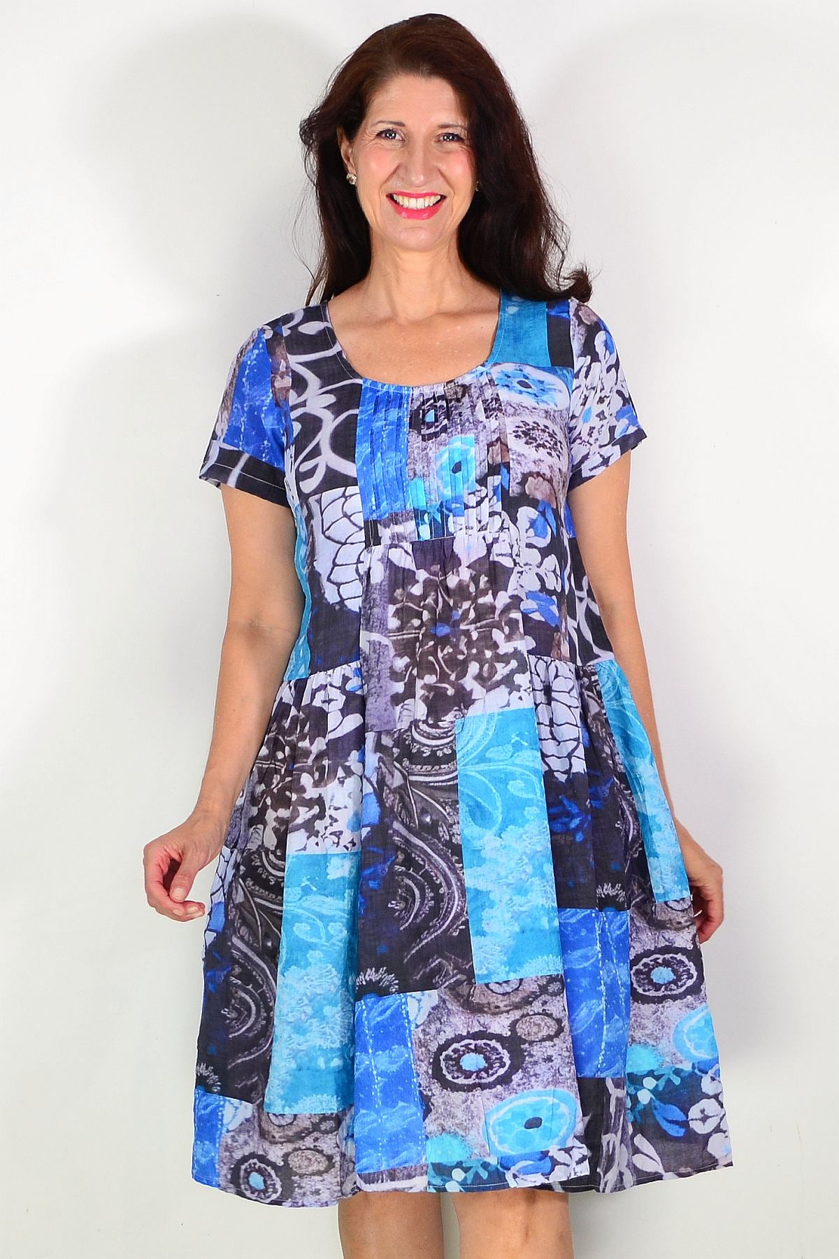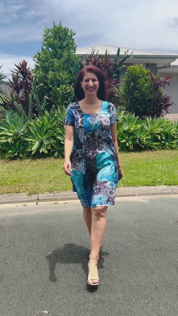 Regular price $59.99Effortlessly elegant, this blue abstract tunic dress combines contemporary style with thoughtful design. The lightweight cotton-rayon blend ensures breathable comfort through warmer months, while pintuck pleats at the bust provide graceful movement and a refined silhouette. Rich dark brown and blue tones create visual depth across the abstract print, with each piece featuring its own unique pattern variation. The scoop neckline and short sleeves offer understated sophistication, while the A-line cut flows to a flattering knee length. Perfect for casual outings or relaxed gatherings, this versatile piece transitions seamlessly from day to evening wear.