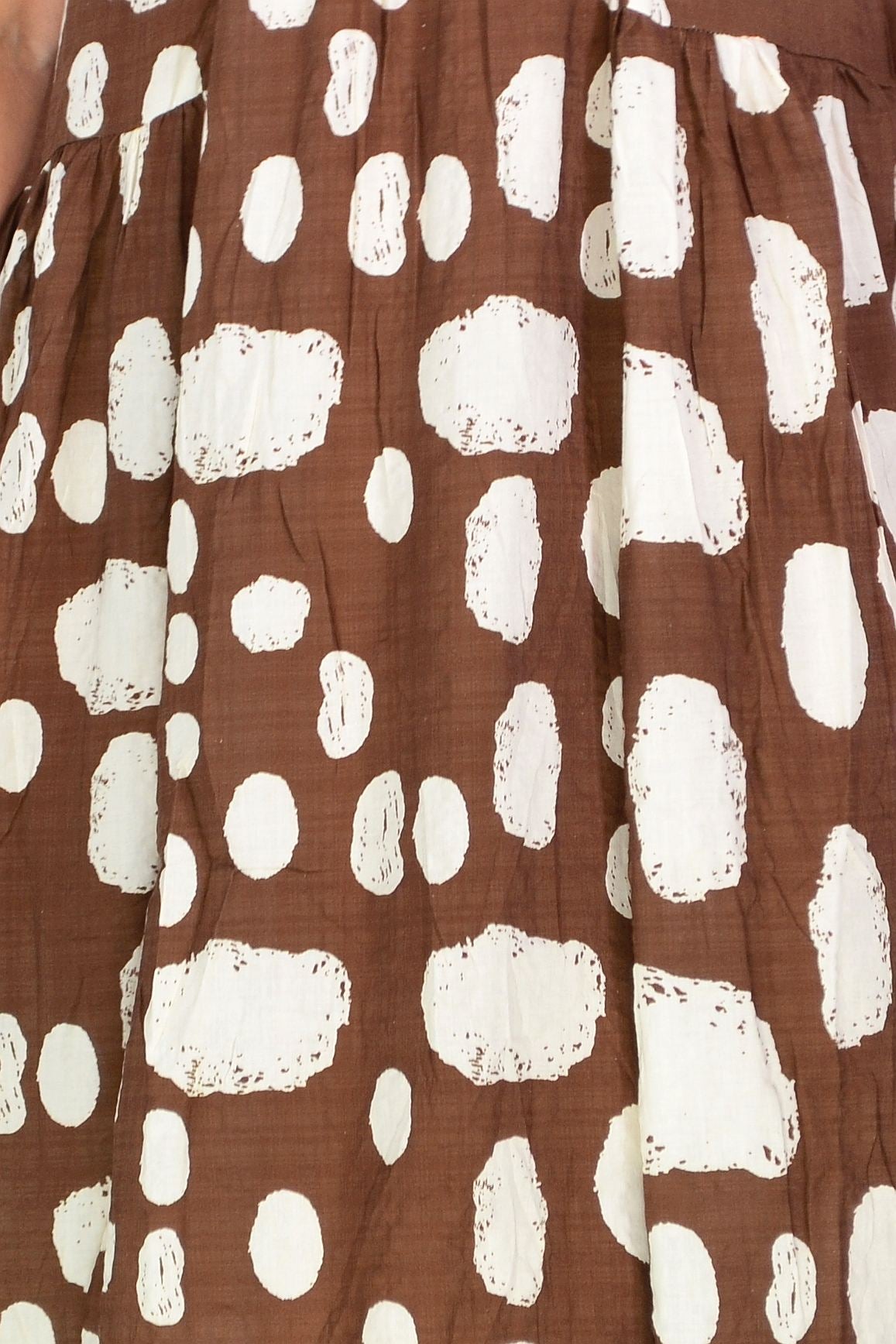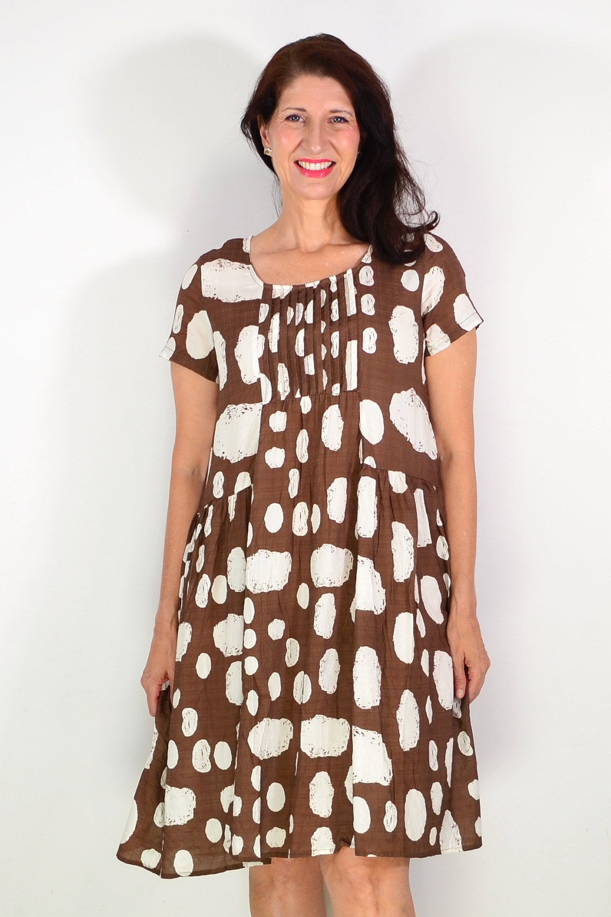 This elegant tunic dress combines timeless style with everyday comfort. The rich brown background features a charming offwhite cream spotted print, creating a sophisticated colour palette that transitions effortlessly from season to season. Crafted from a breathable summer-weight blend of 65% cotton and 35% rayon, the fabric drapes beautifully without restriction. The flattering A-line silhouette is enhanced by pintuck pleats at the bust, offering both graceful movement and a refined shape. Short sleeves and a classic scoop neckline complete the relaxed yet polished design, while the knee-length hem provides versatile styling options. Each piece features a unique print variation, ensuring your tunic is truly one-of-a-kind.