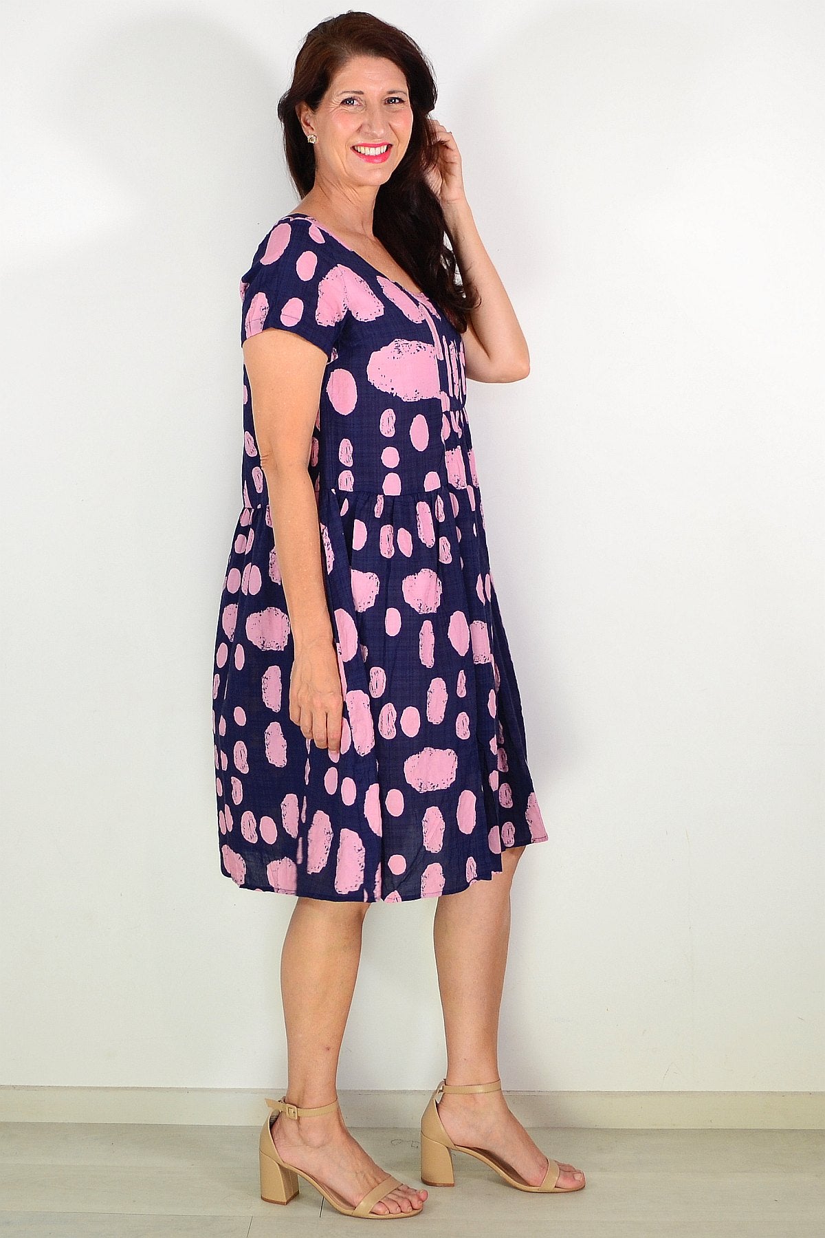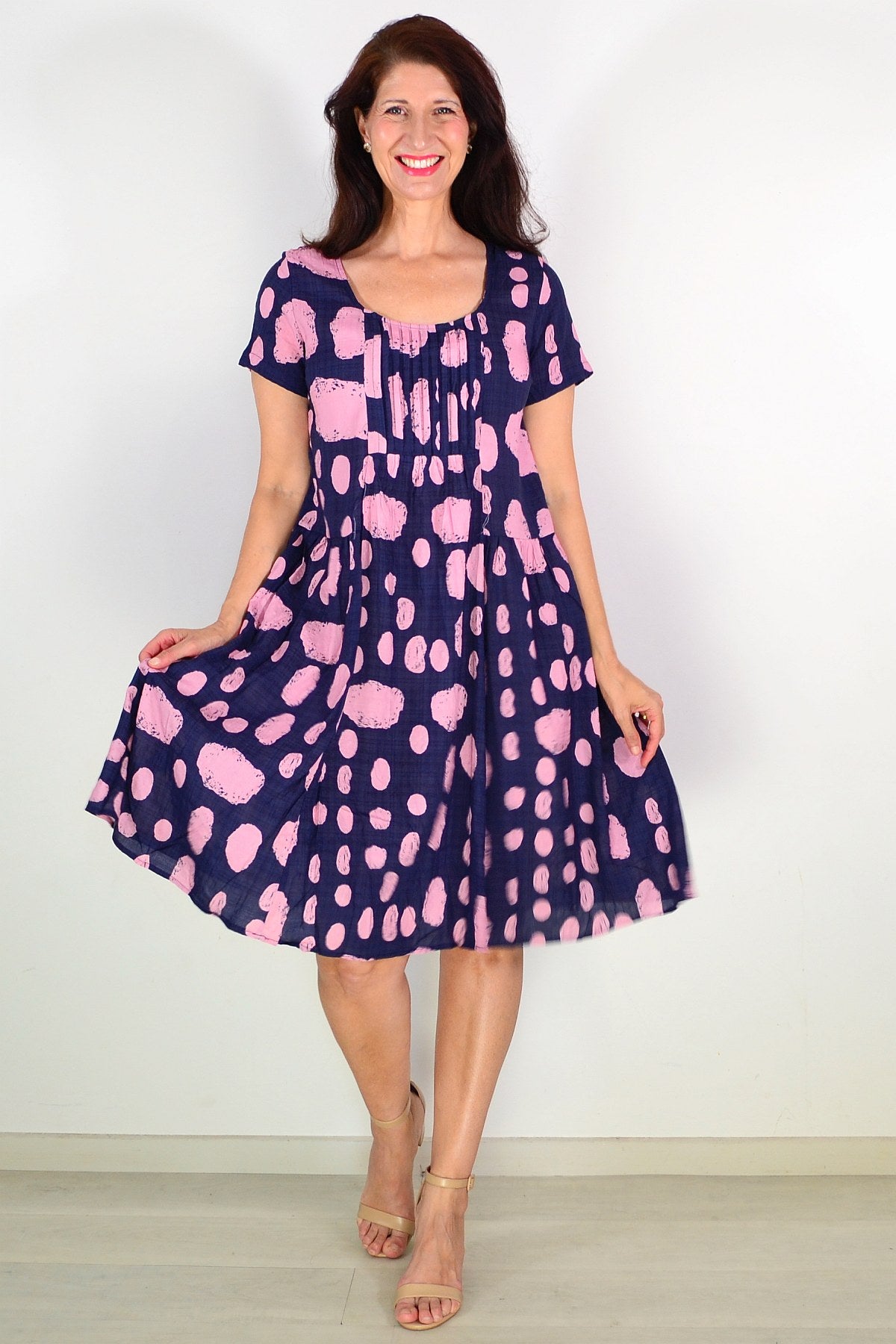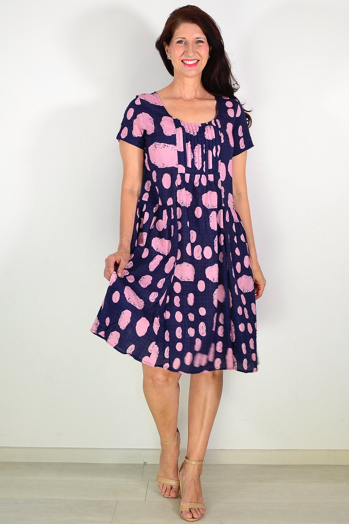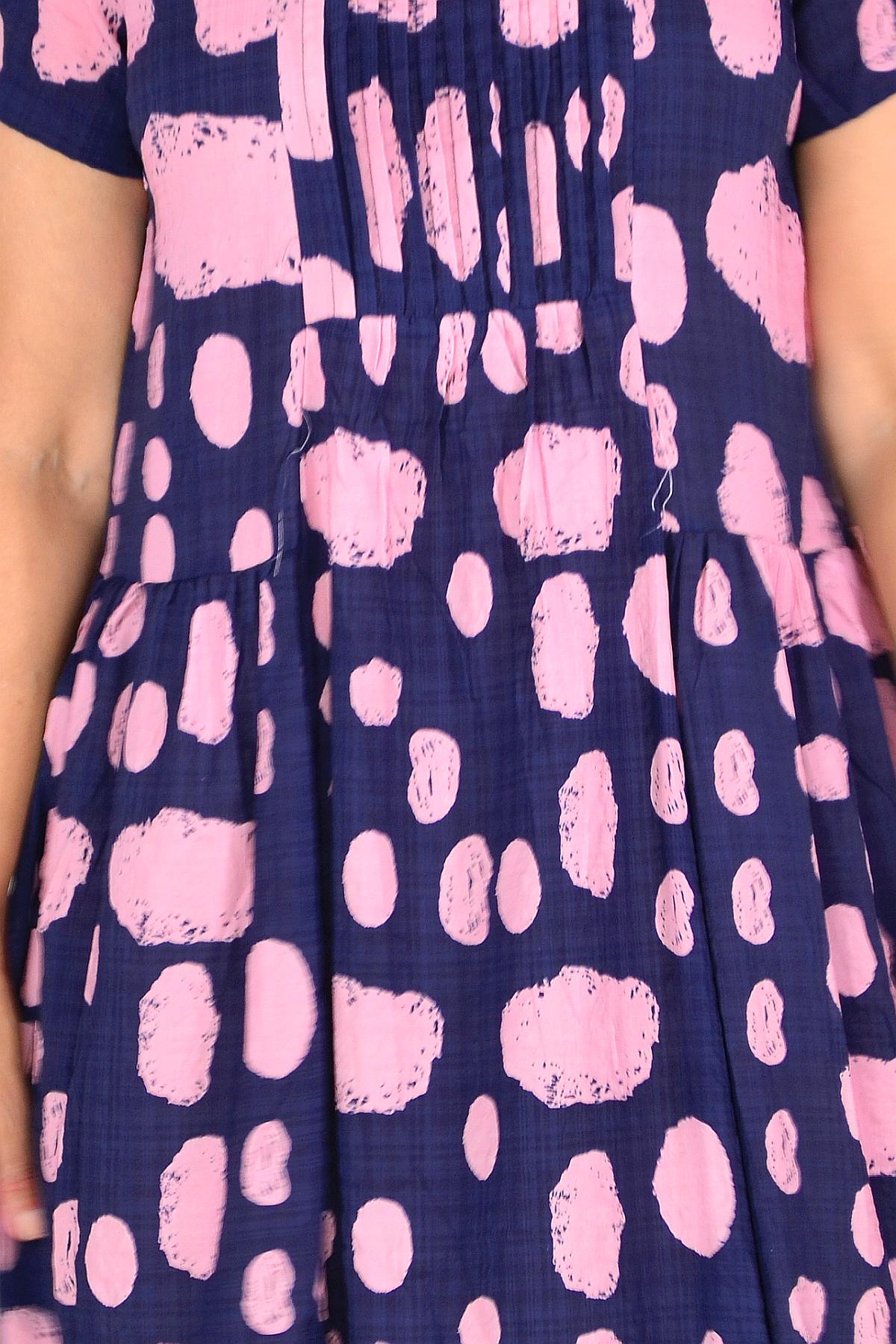 Navy Pink Spot Pleated Casual Tunic Dress