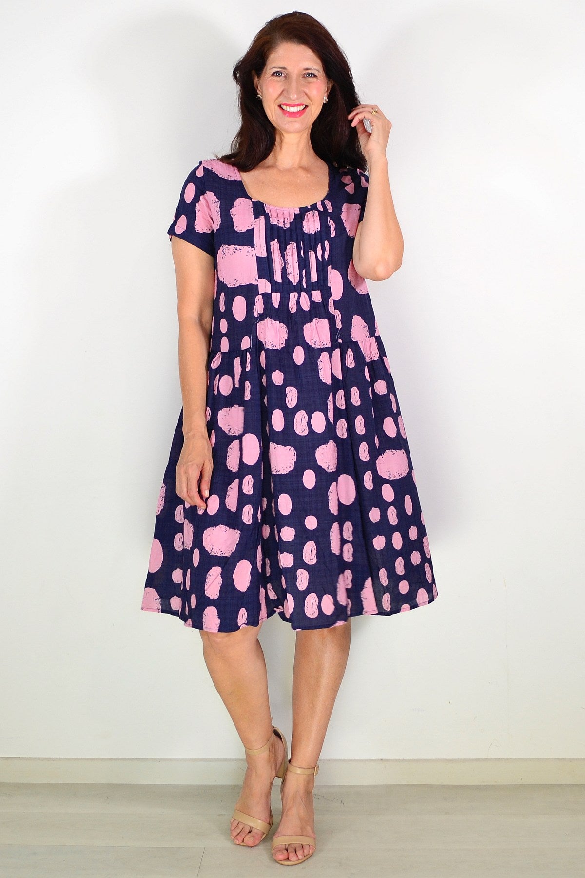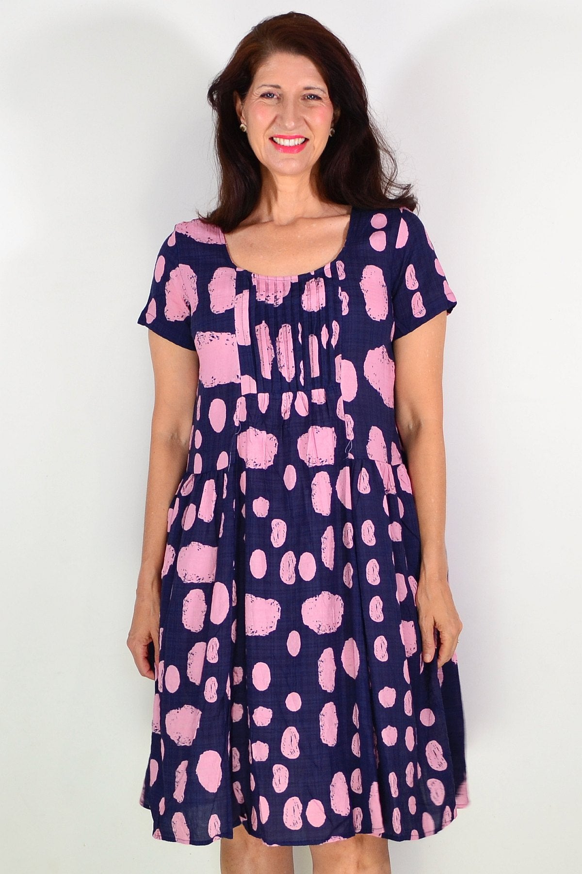 Regular price $59.99Effortlessly chic, this navy tunic dress features a charming salmon pink spotted print that brings warmth and personality to your everyday wardrobe. Crafted from a breathable cotton-rayon blend, it's perfectly weighted for warmer months without clinging to your frame. The flattering A-line silhouette is enhanced by delicate pintuck pleats at the bust, offering both graceful movement and a refined shape. A scoop neckline and short sleeves keep things relaxed, while the knee-length hem strikes that ideal balance between casual and put-together. Each piece's unique print variation ensures your tunic is truly one-of-a-kind.