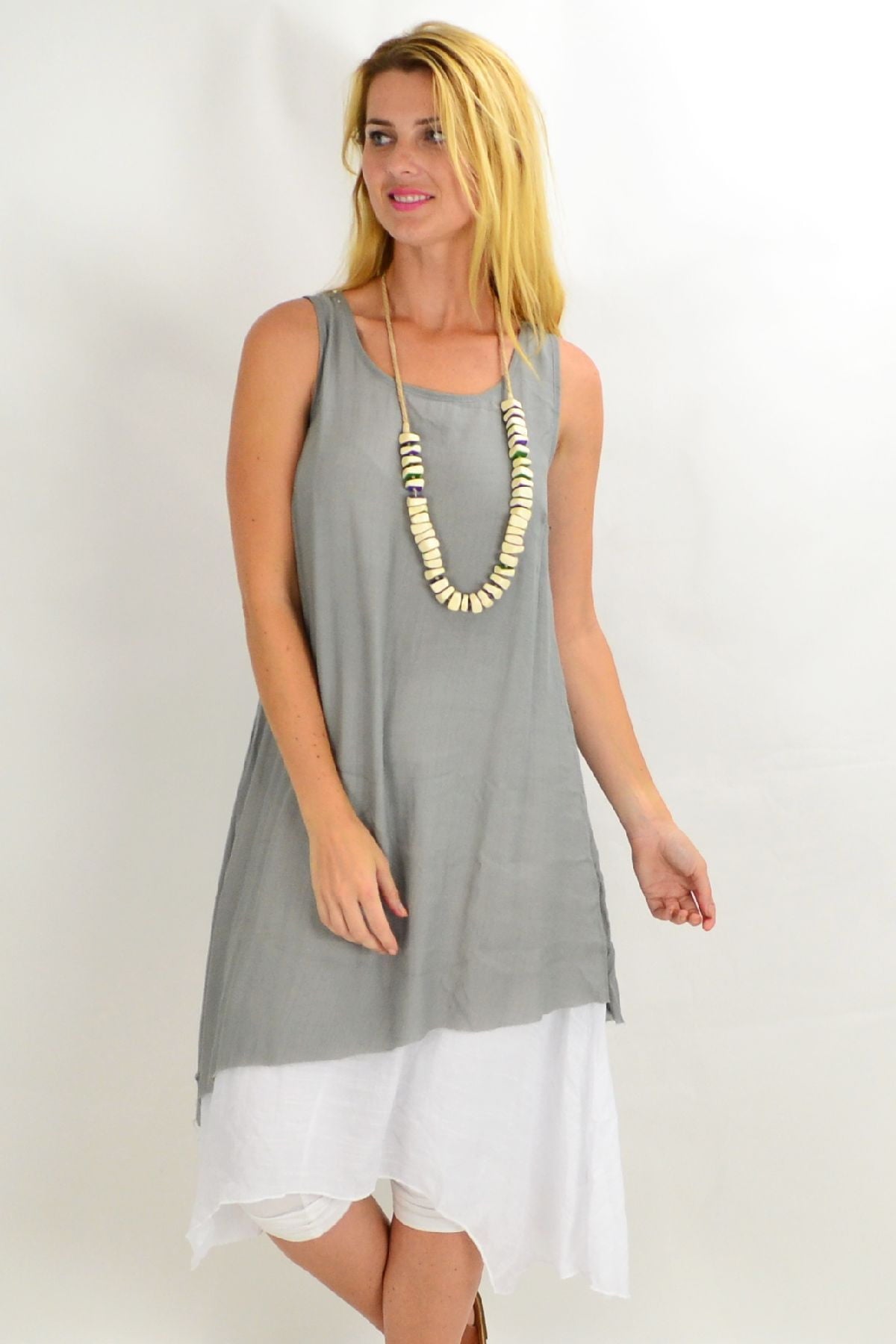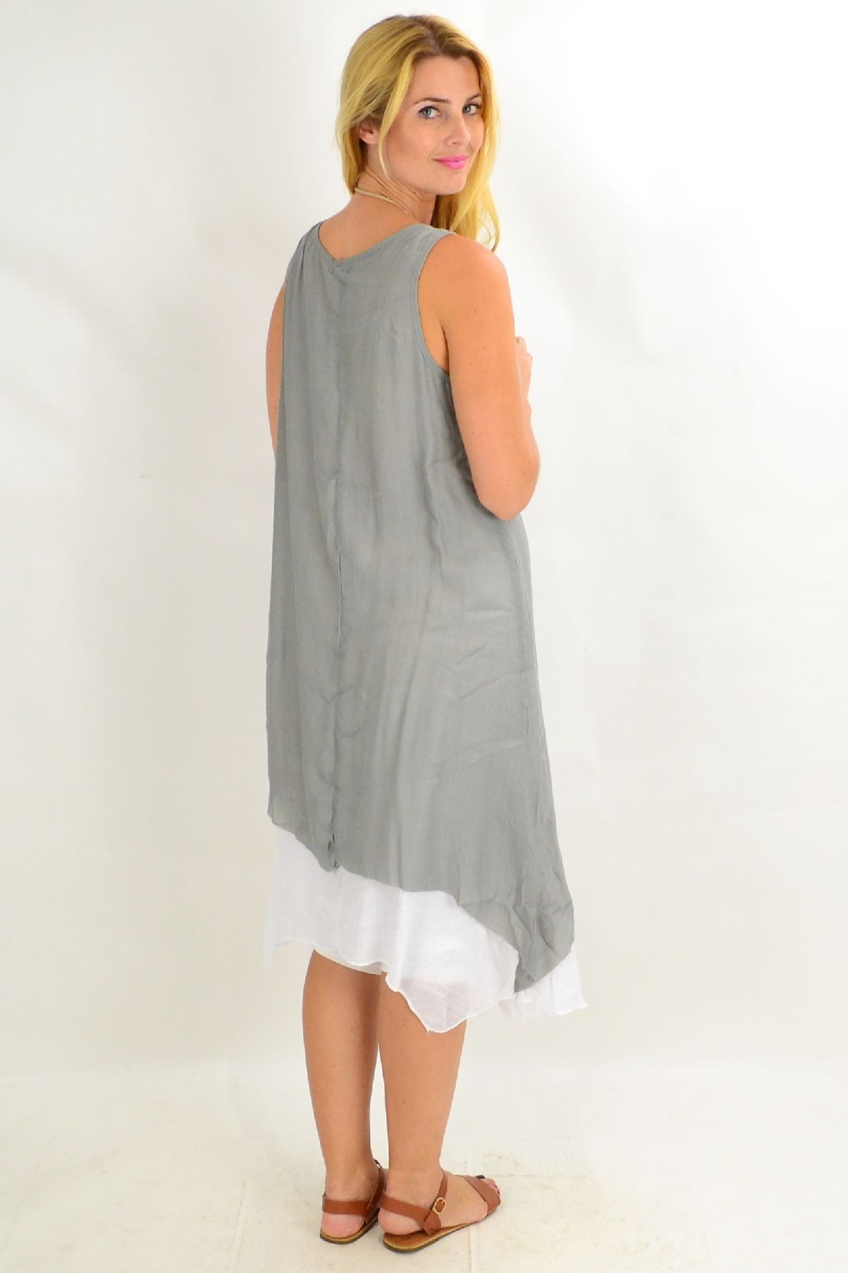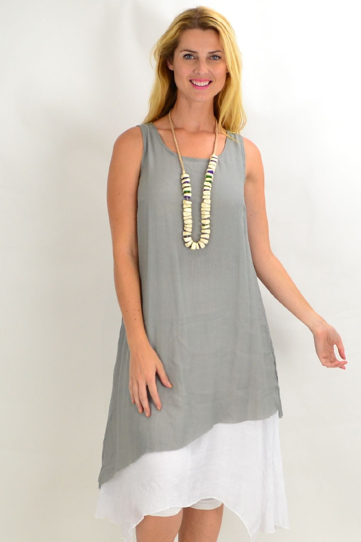 This Grey Asymmetrical Hem Tunic Dress is the perfect start to the warmer weather. Made in a woven crinkle fabric that falls easily over the body, with no sleeves, scooped neck and has a white underlay that provides a flattering drape. Feel comfortable, relaxed in this everyday dress.