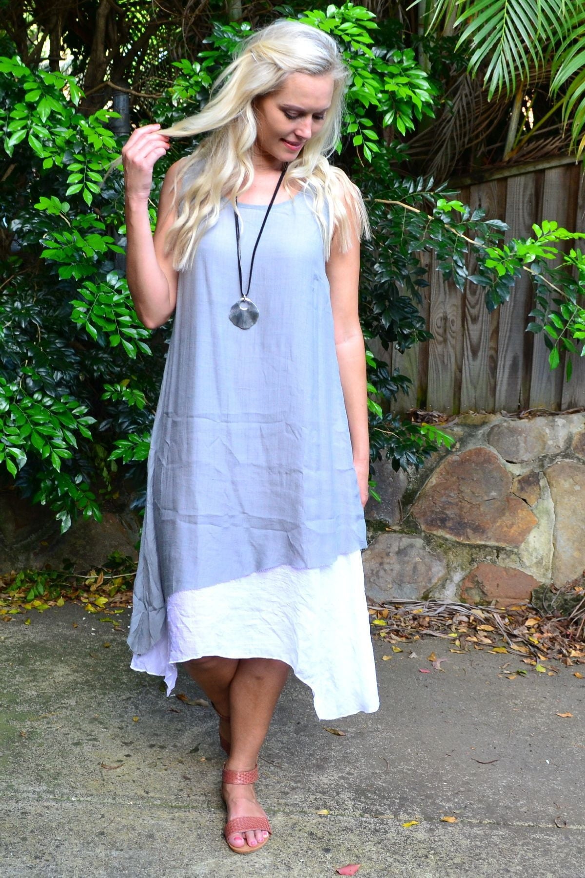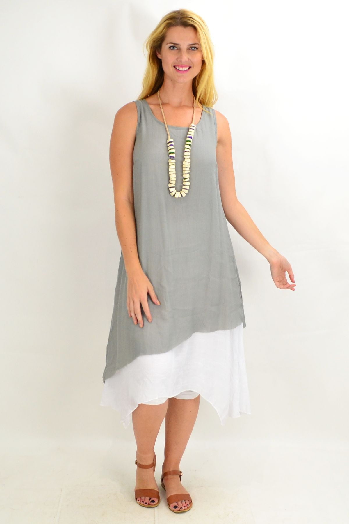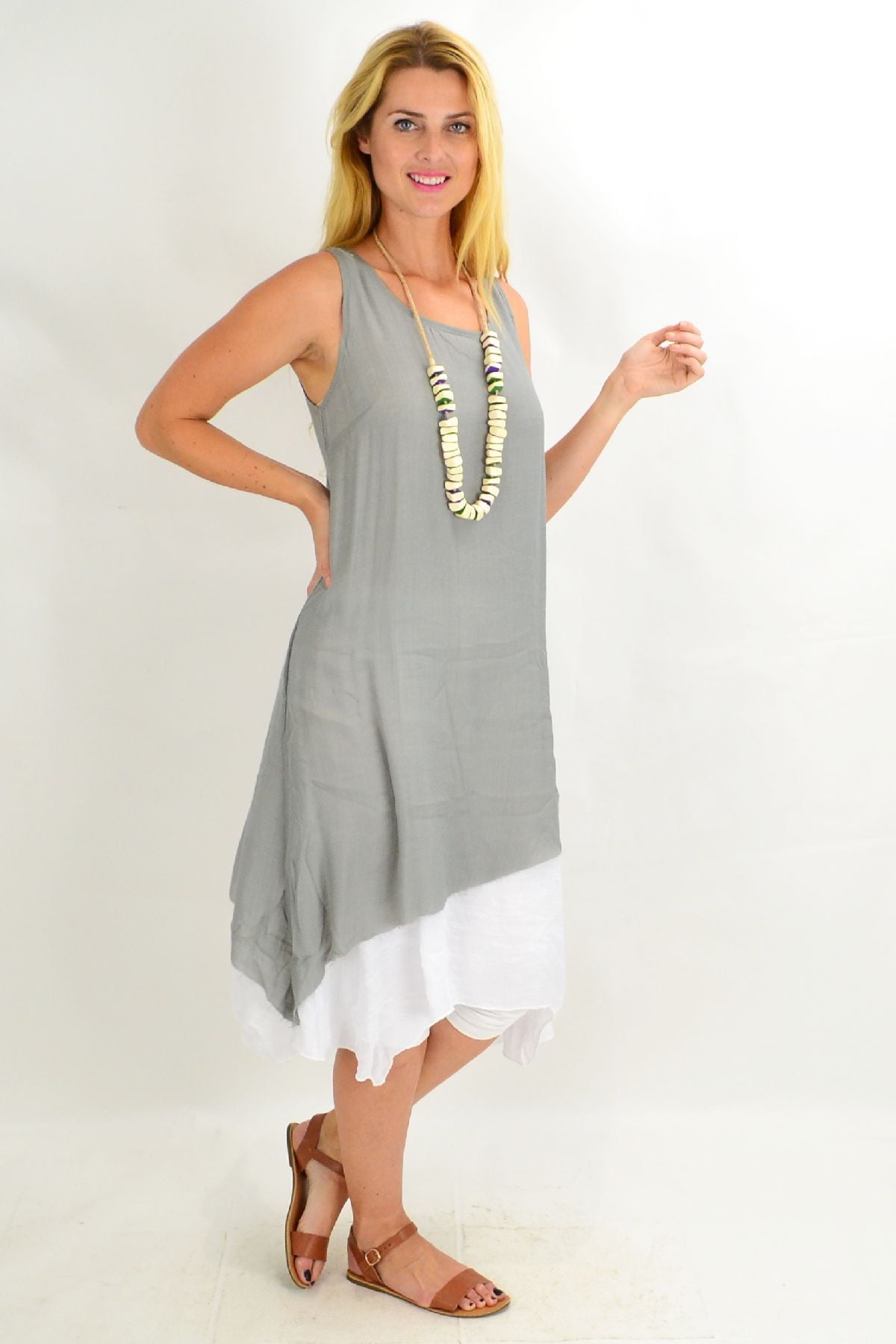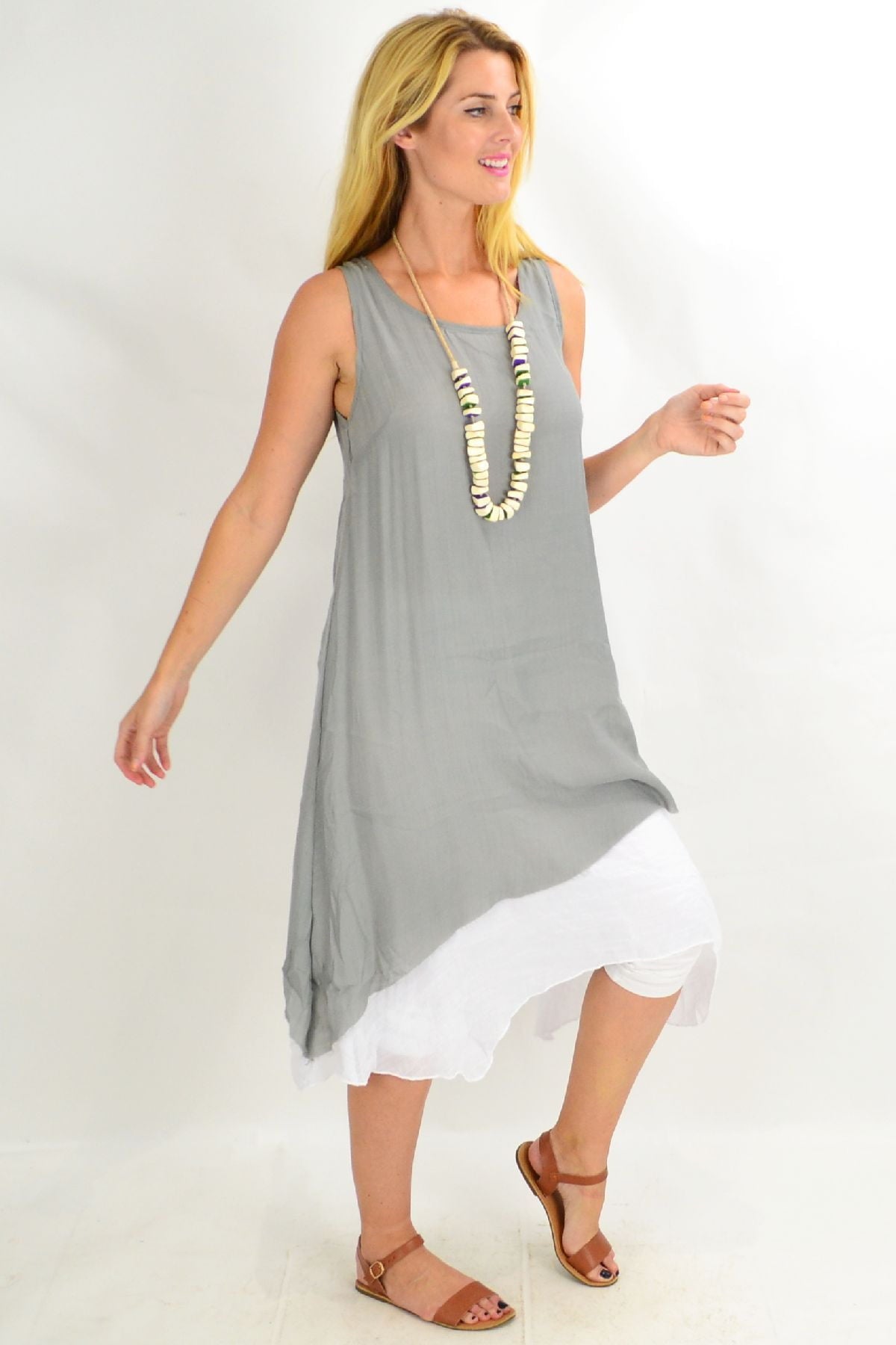 This Grey Asymmetrical Hem Tunic Dress is the perfect start to the warmer weather. Made in a woven crinkle fabric that falls easily over the body, with no sleeves, scooped neck and has a white underlay that provides a flattering drape. Feel comfortable, relaxed in this everyday dress.