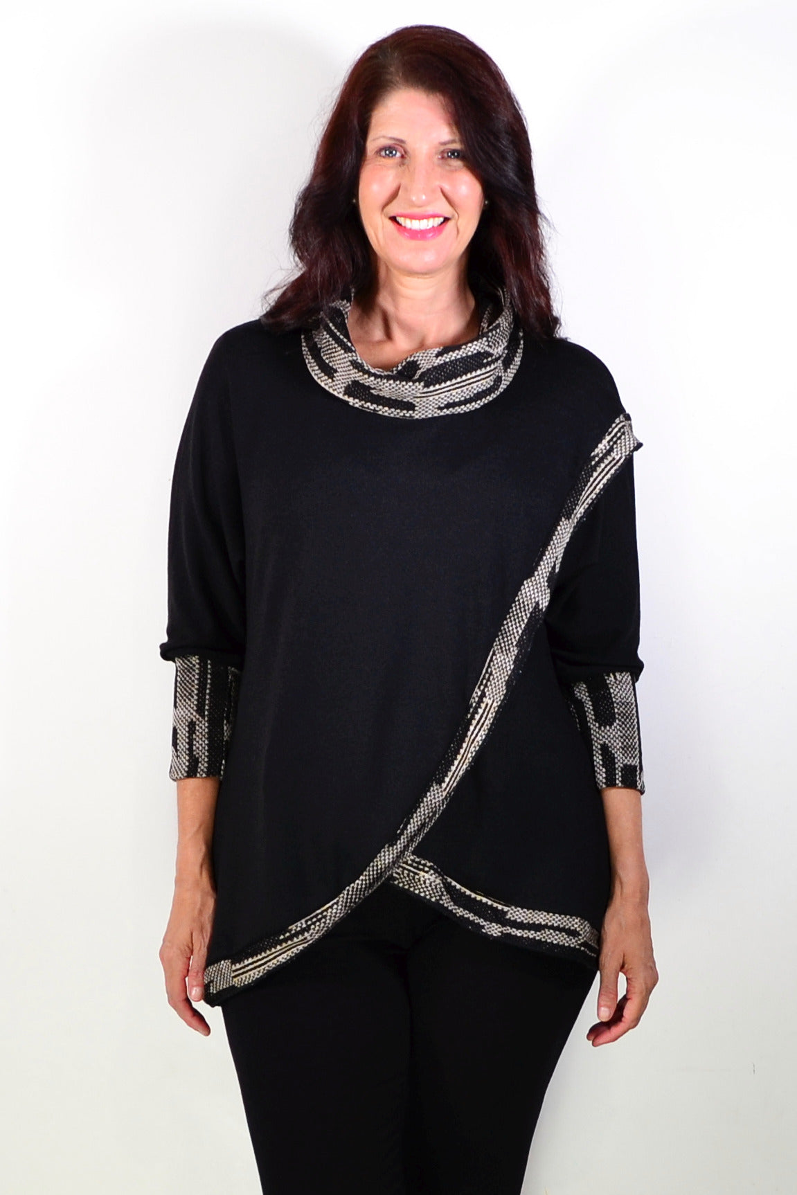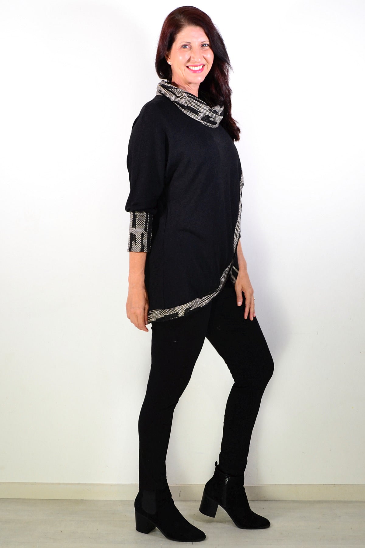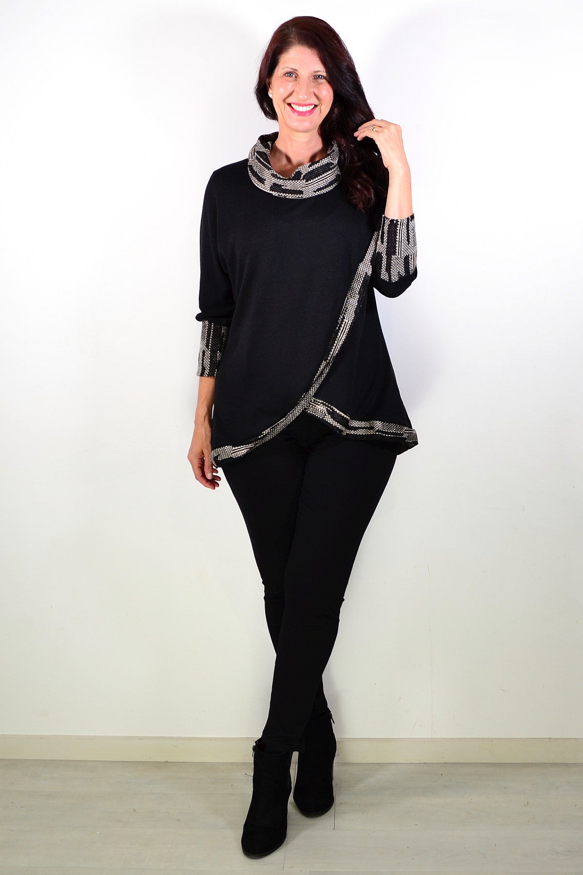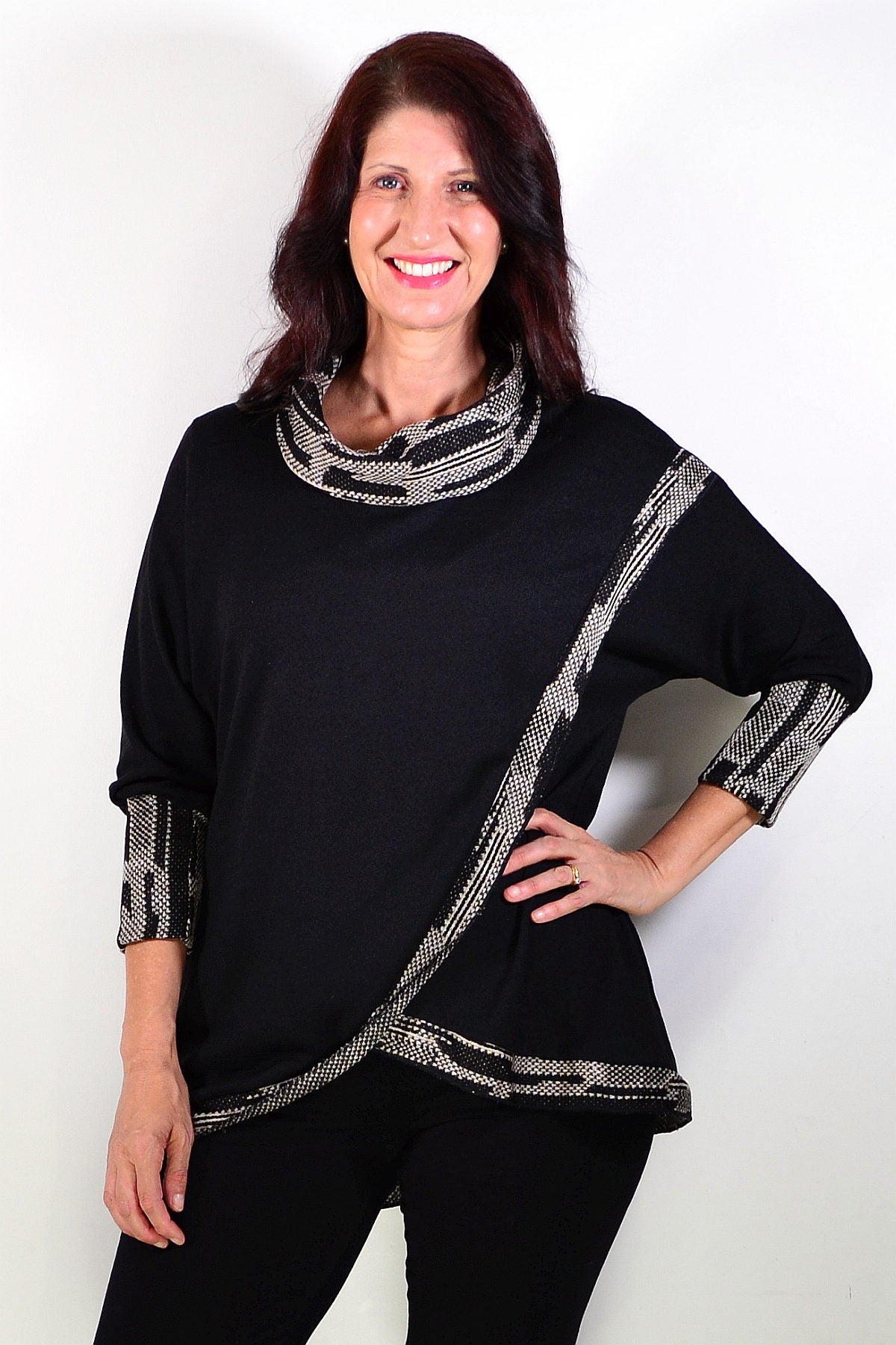 Black Women's Tunic Blouse with Grey Contrast Trim around front, neck and cuffs. featuring soft cotton blend knitted fabric and cowl neck - softly draped and folded around the neckline