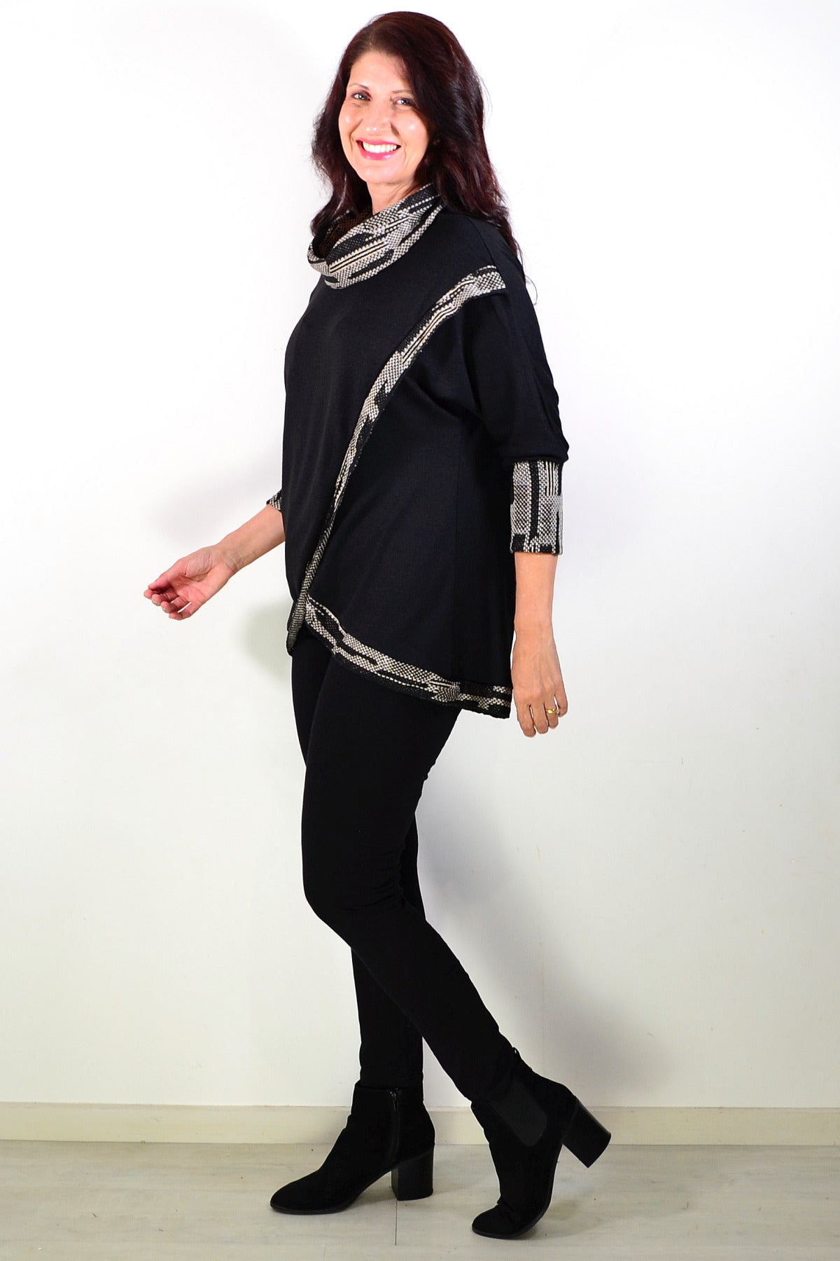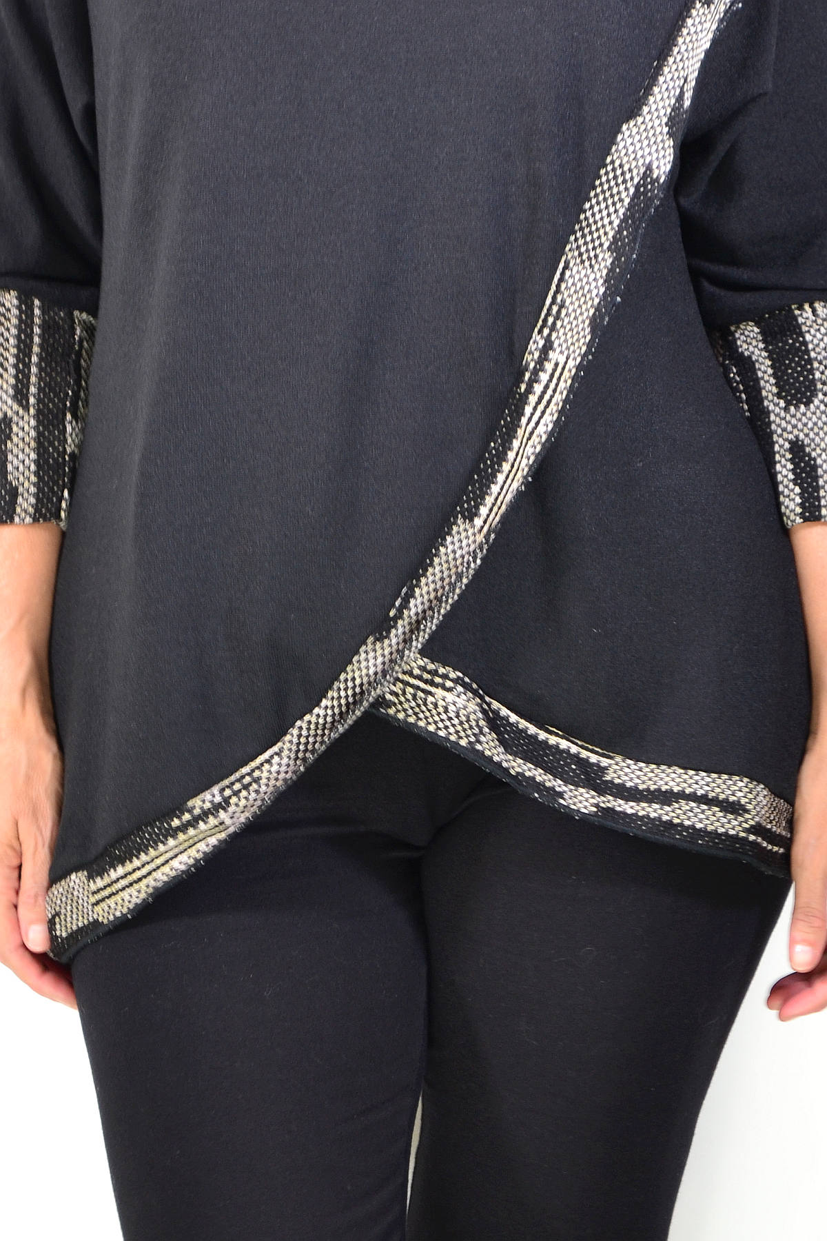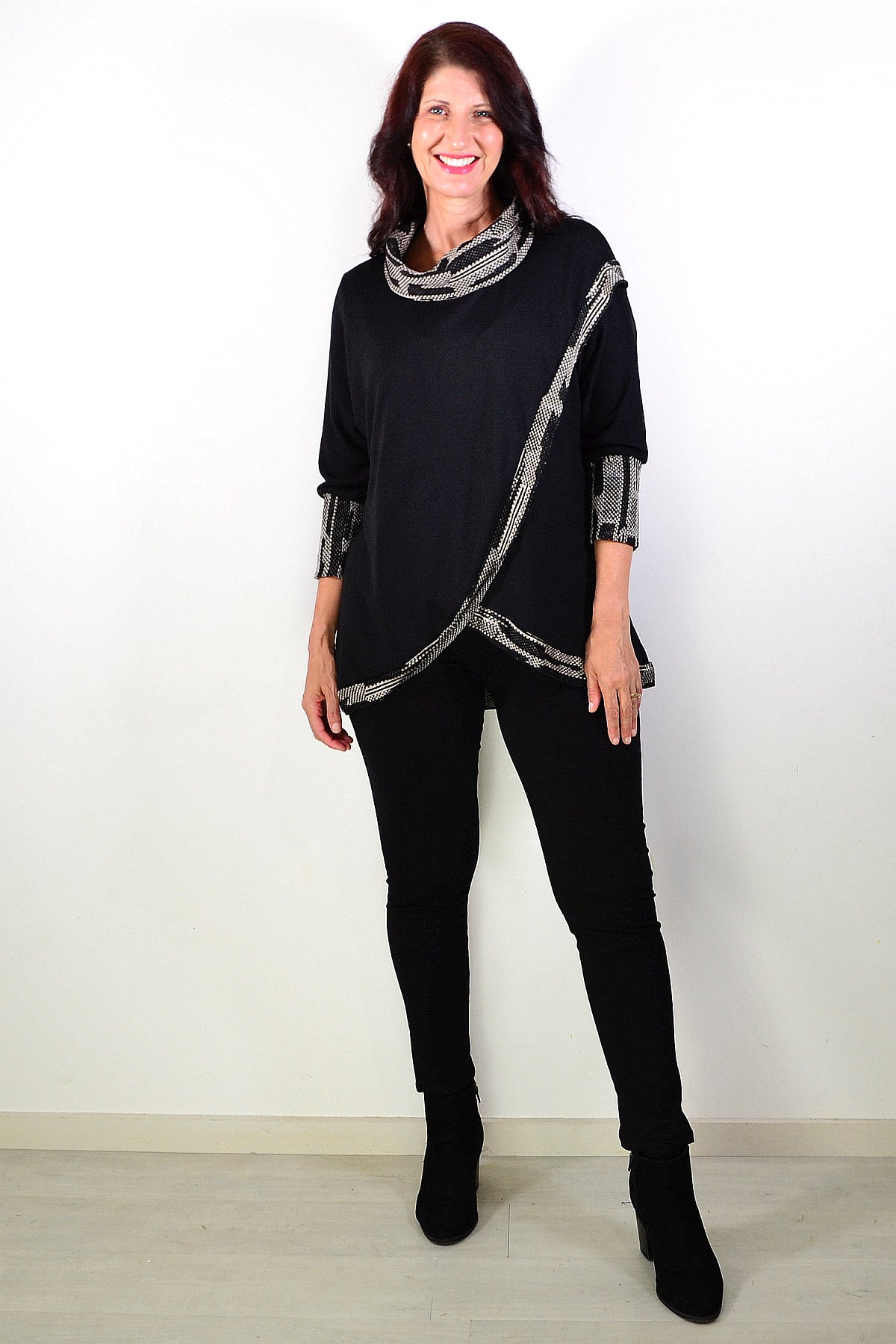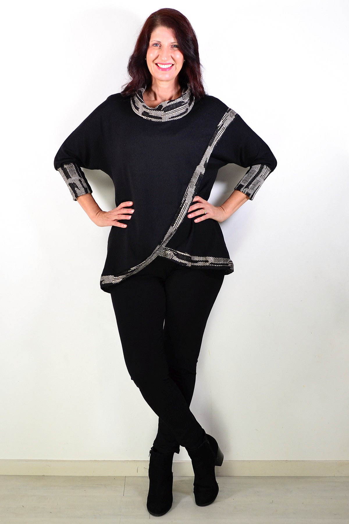 Black Women's Tunic Blouse with Grey Contrast Trim around front, neck and cuffs. featuring soft cotton blend knitted fabric and cowl neck - softly draped and folded around the neckline