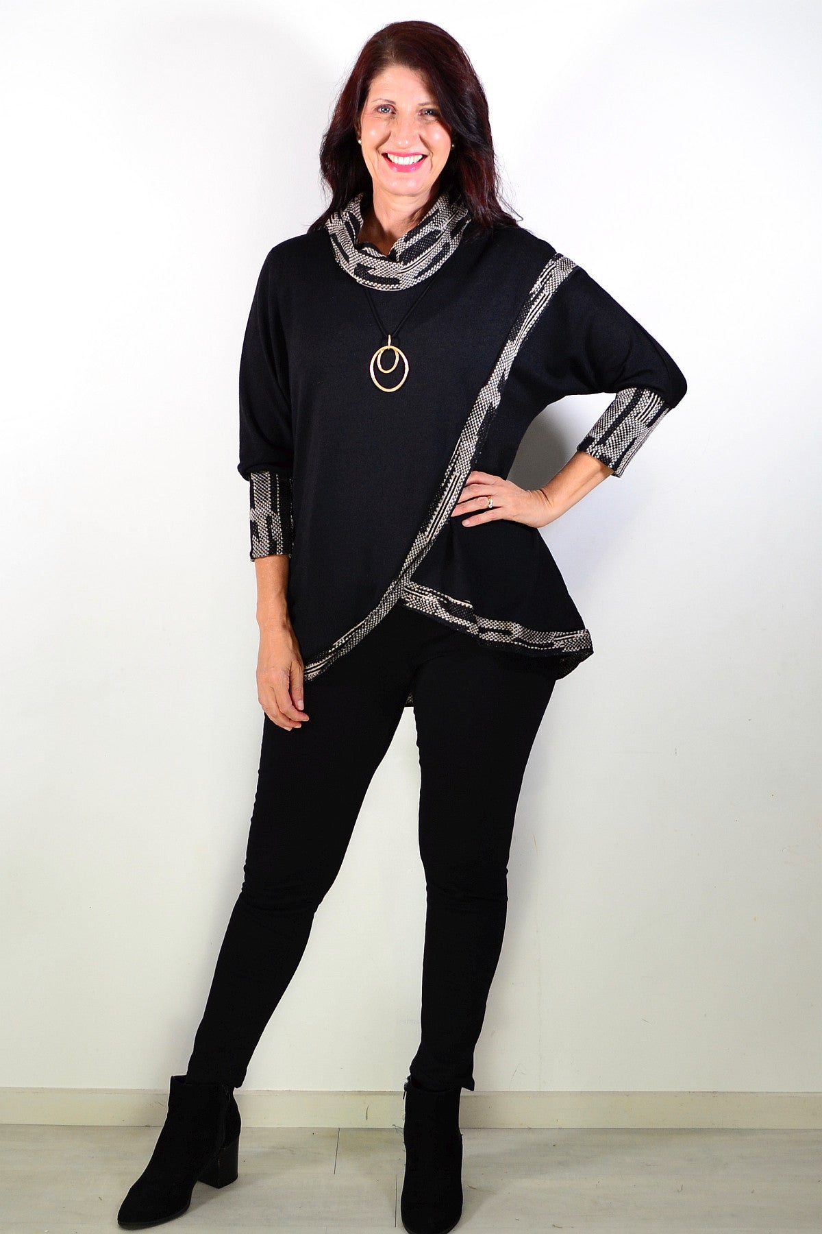 Regular price $59.00Stay effortlessly stylish in this black women’s tunic blouse, designed with elegant grey contrast trim along the front, neckline, and cuffs. Crafted from a soft cotton-polyester knit, it offers a comfortable medium-weight feel with a slight stretch—perfect for cooler days. The softly draped cowl neck adds a touch of sophistication while providing warmth and shape. Featuring flattering 3/4 length sleeves and a relaxed longline fit that falls below the hips, this tunic pairs beautifully with leggings or slim pants. Ideal for both casual wear and smart everyday styling, it’s a versatile wardrobe essential for winter and beyond.