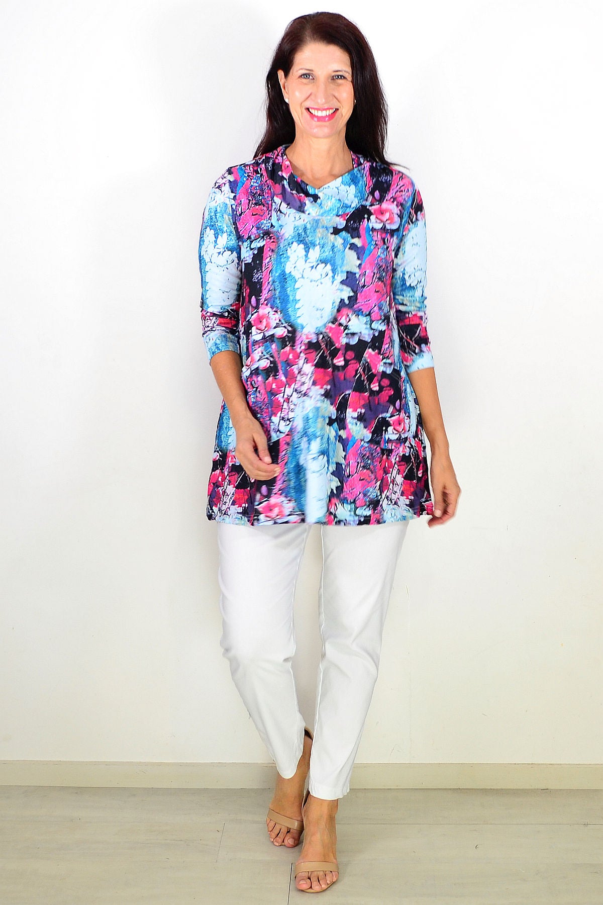 Blue Floral Leaves Tunic Top features luxurious soft cotton blended fabric with multicolour leaves floral print pattern