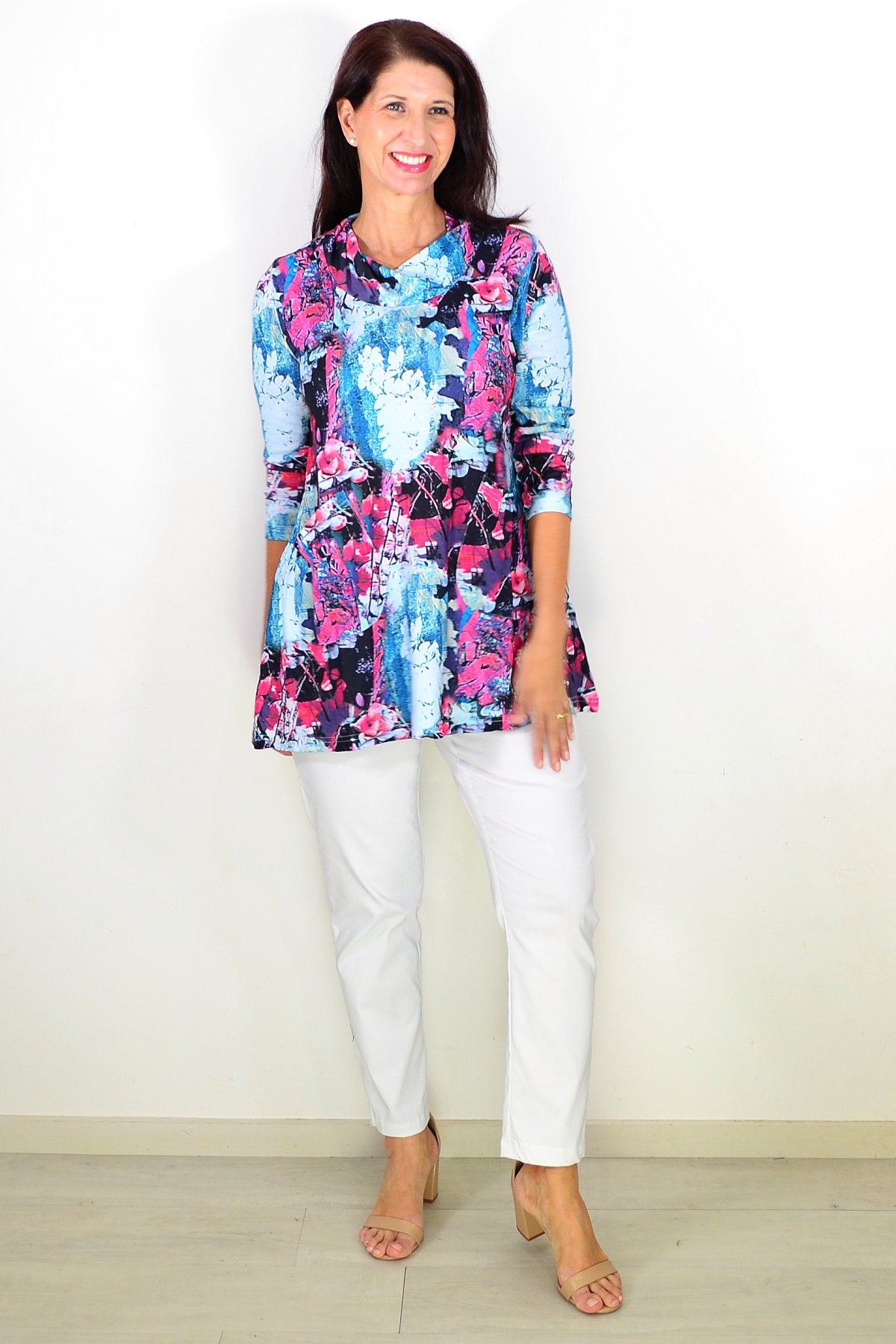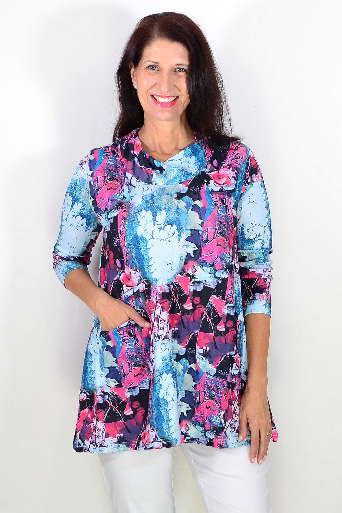 Regular price $59.00Elevate your wardrobe with our Blue Floral Leaves Tunic Top. This luxurious top features a soft cotton blend fabric with a beautiful multicolored floral print. With 7/8 sleeves and front pockets, it's perfect for on-the-go fashion. Its stylish cowl neckline adds a touch of sophistication while the below hips length flatters any figure. Get ready to turn heads with this must-have transeasonal piece!