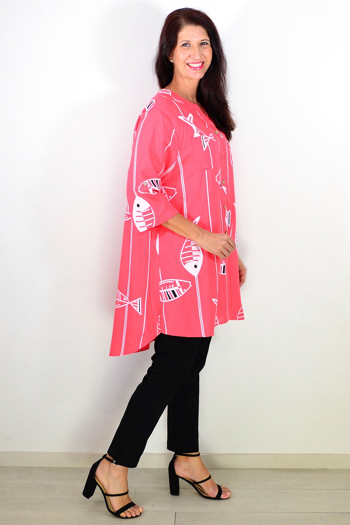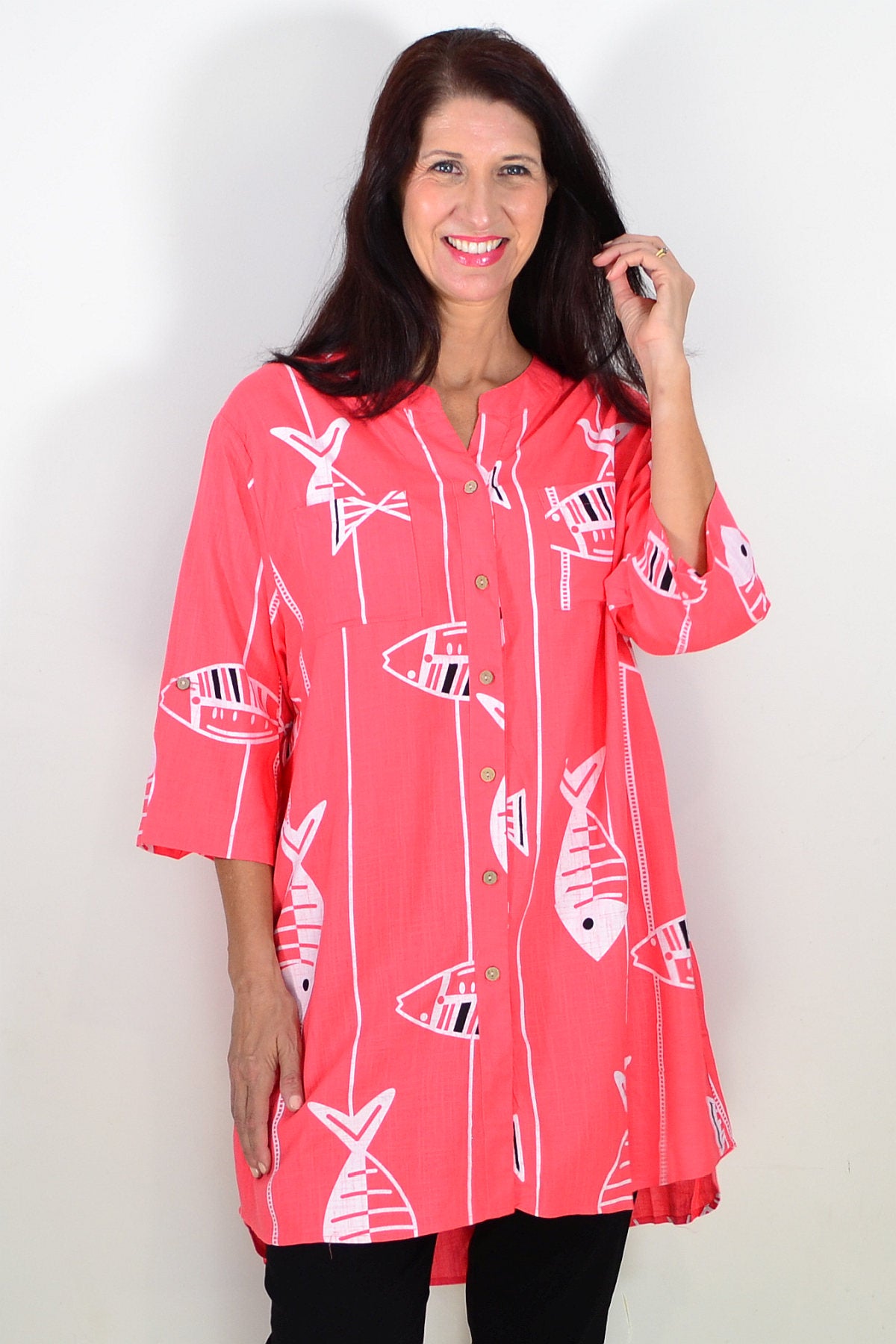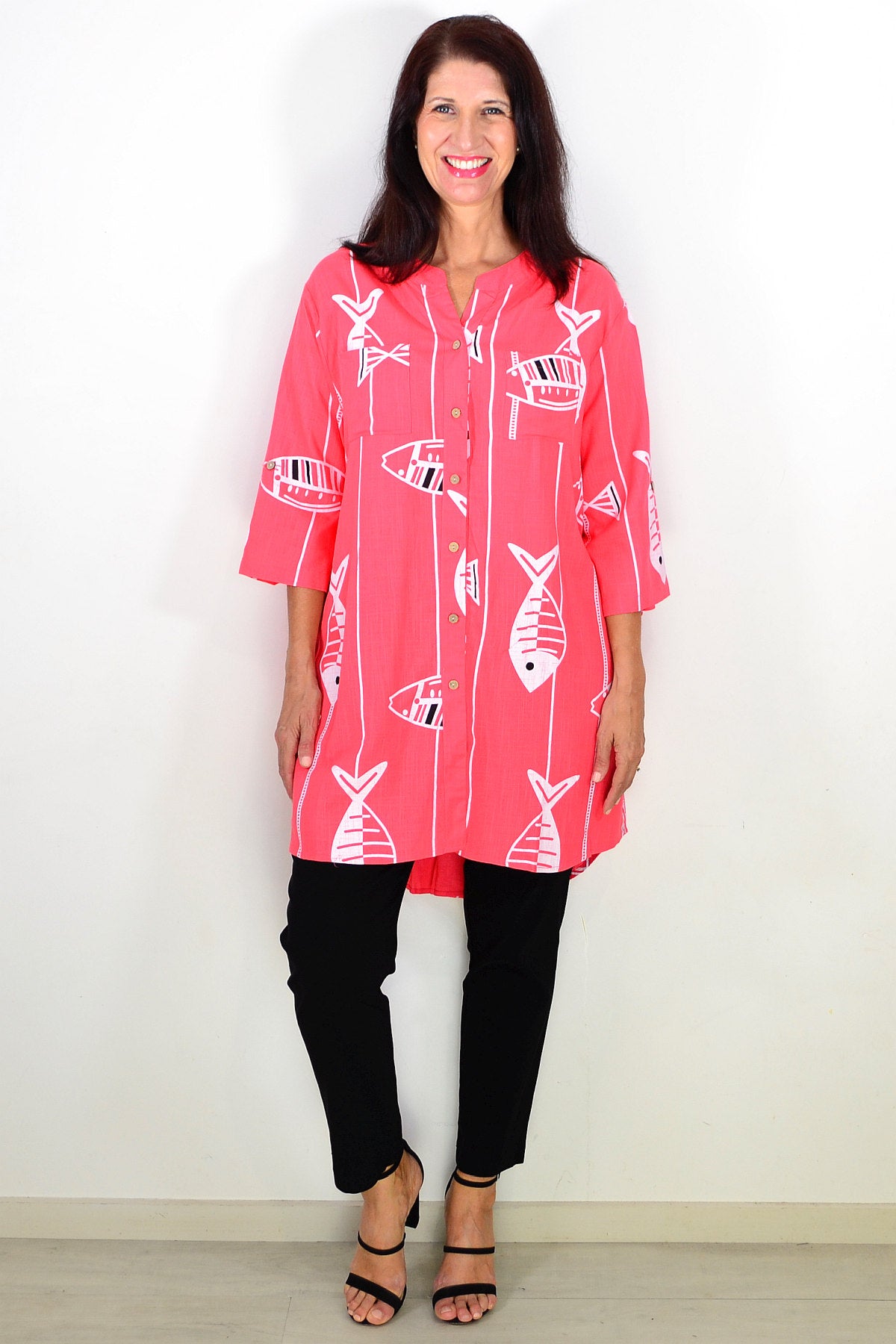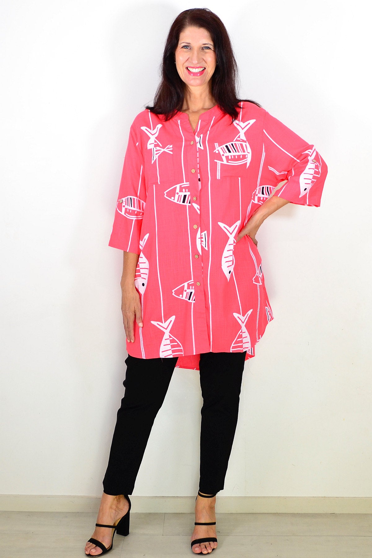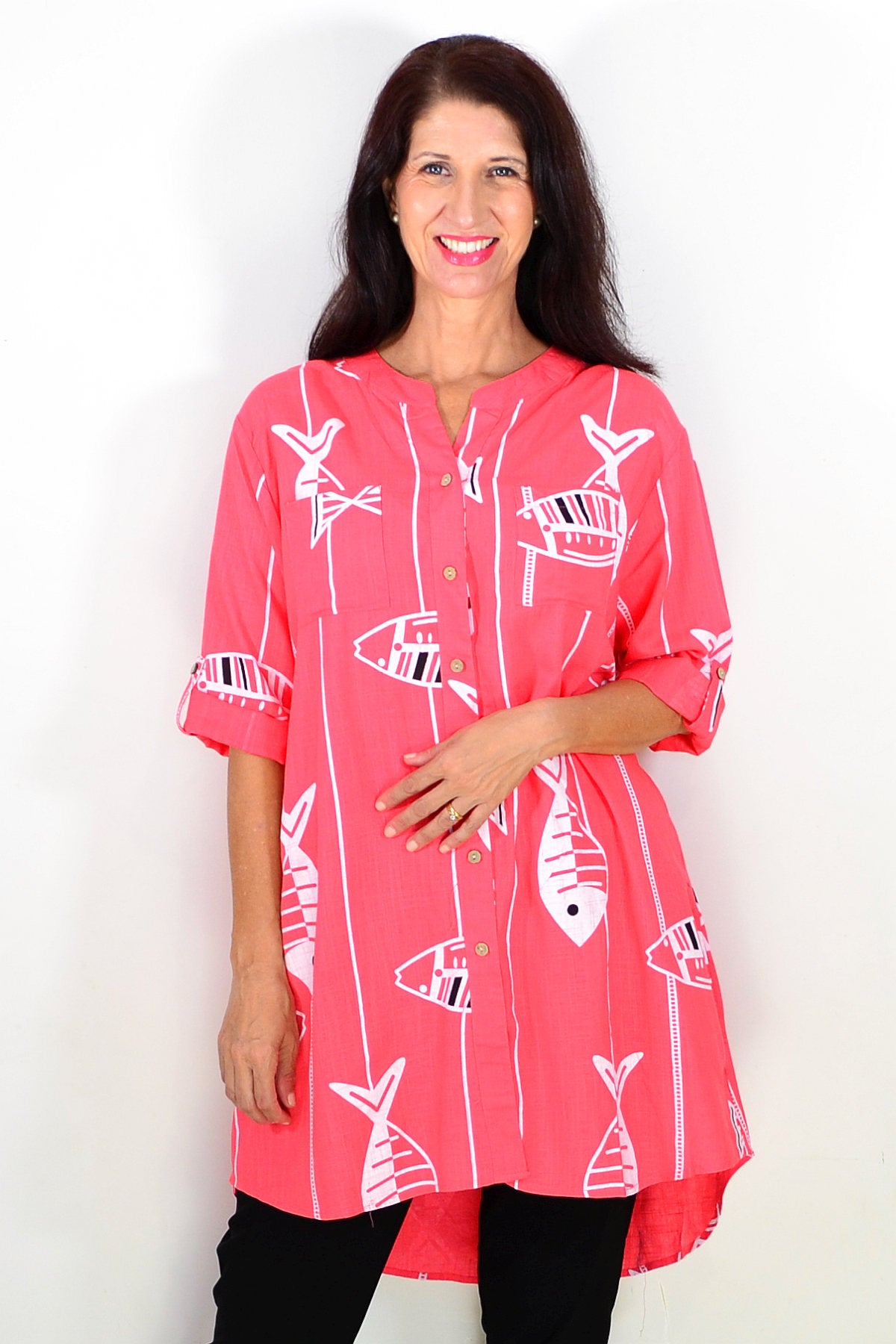 Regular price $59.99Discover the Relaxed Coral Pink Hi-Low Tunic Shirt, made from a premium linen-cotton blend for breathable, medium-weight comfort. Set on a soft coral pink base, it features a playful white fish print that brings a touch of charm to both casual and smart-casual looks. Designed with 3/4 sleeves, button-and-loop detailing, and a flattering V-neckline, it offers effortless style. The hi-low hem falls smoothly below the hips for a relaxed silhouette. Wear it buttoned or open over a singlet for versatile layering. A perfect everyday essential combining comfort, elegance, and timeless appeal for mature women.