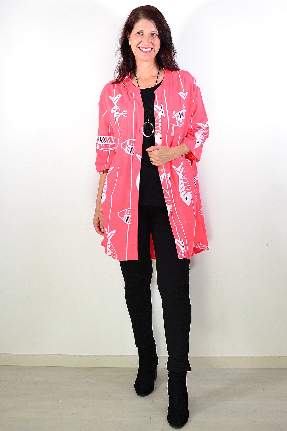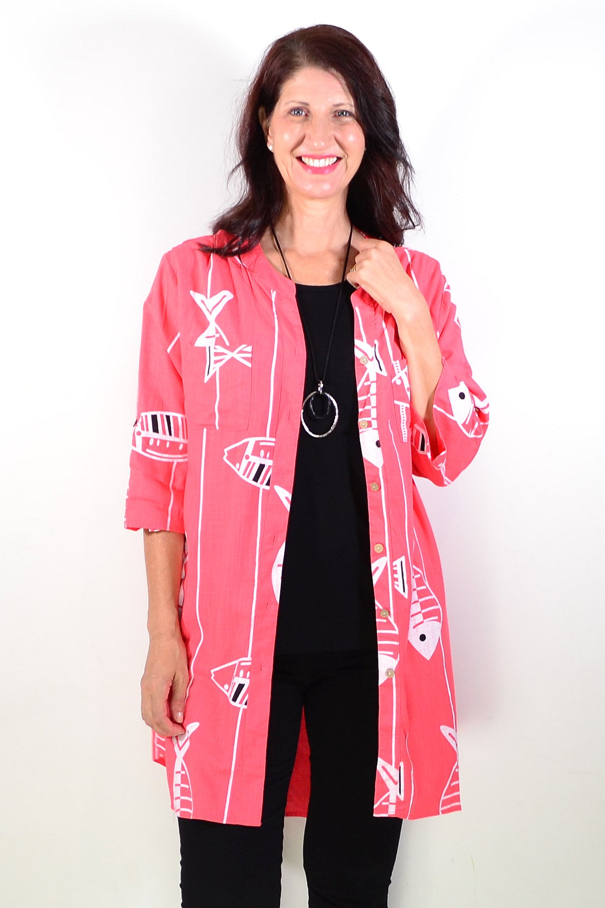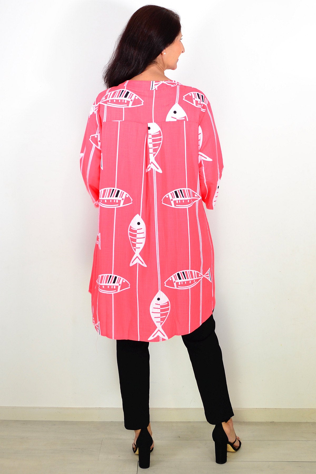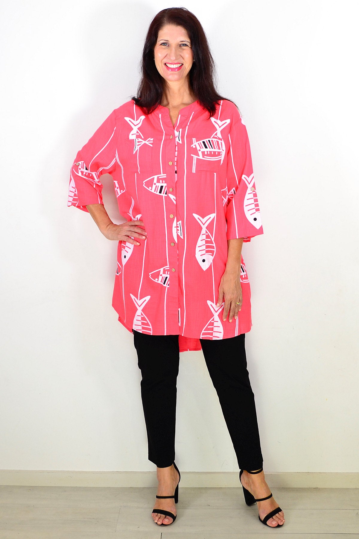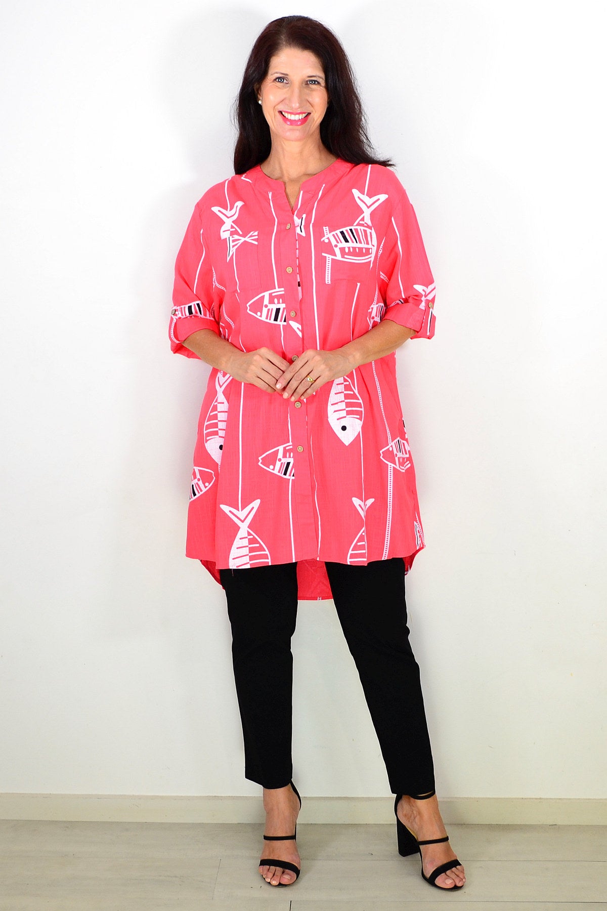 Regular price $59.99Discover the Relaxed Coral Pink Hi-Low Tunic Shirt, made from a premium linen-cotton blend for breathable, medium-weight comfort. Set on a soft coral pink base, it features a playful white fish print that brings a touch of charm to both casual and smart-casual looks. Designed with 3/4 sleeves, button-and-loop detailing, and a flattering V-neckline, it offers effortless style. The hi-low hem falls smoothly below the hips for a relaxed silhouette. Wear it buttoned or open over a singlet for versatile layering. A perfect everyday essential combining comfort, elegance, and timeless appeal for mature women.