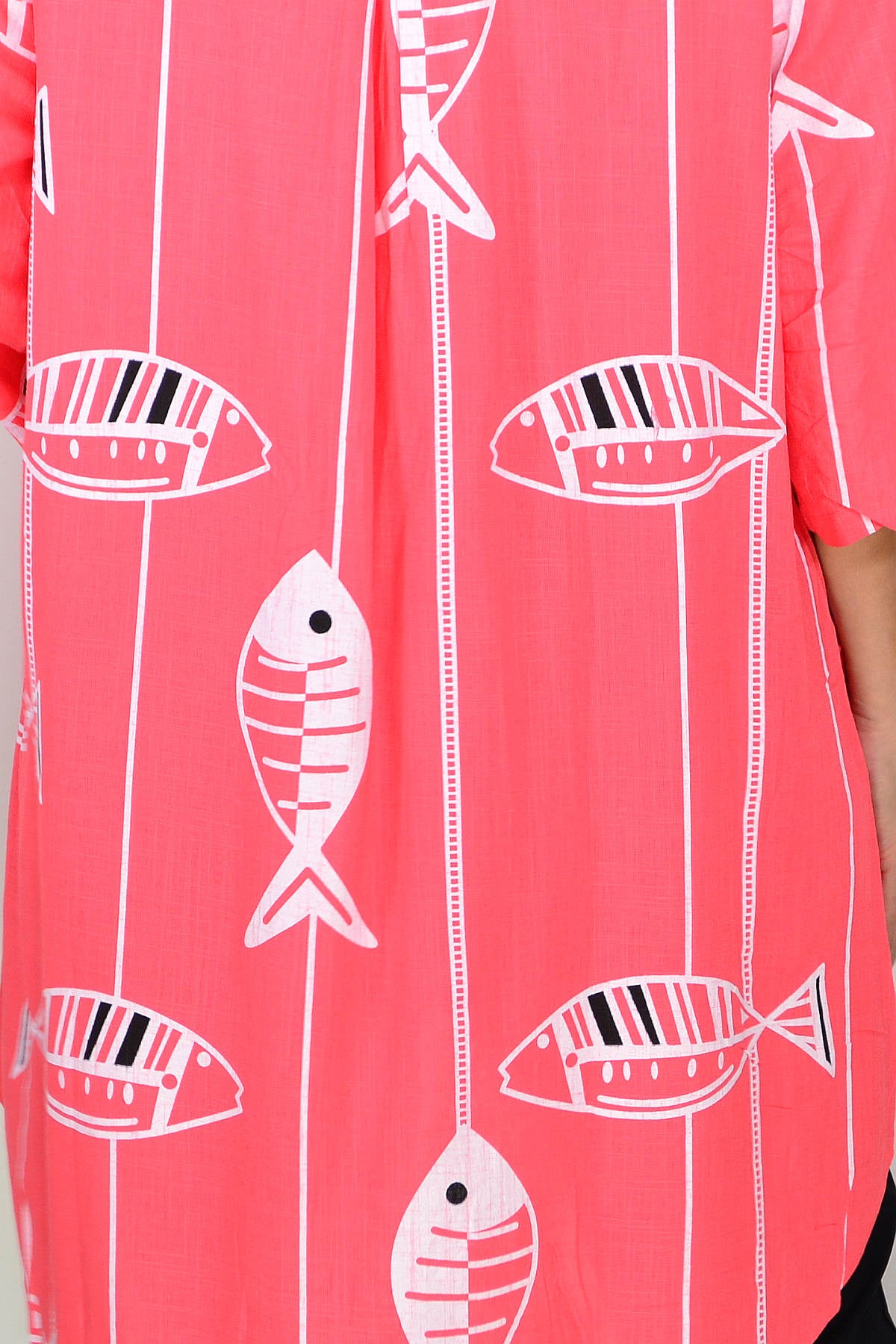 - Features a quirk white fish pattern print on coral pink base