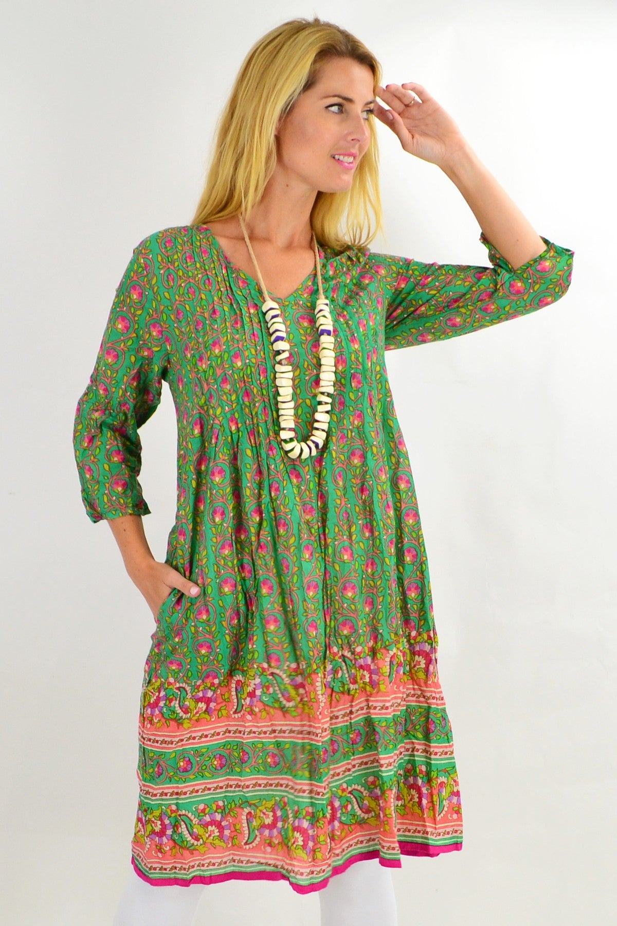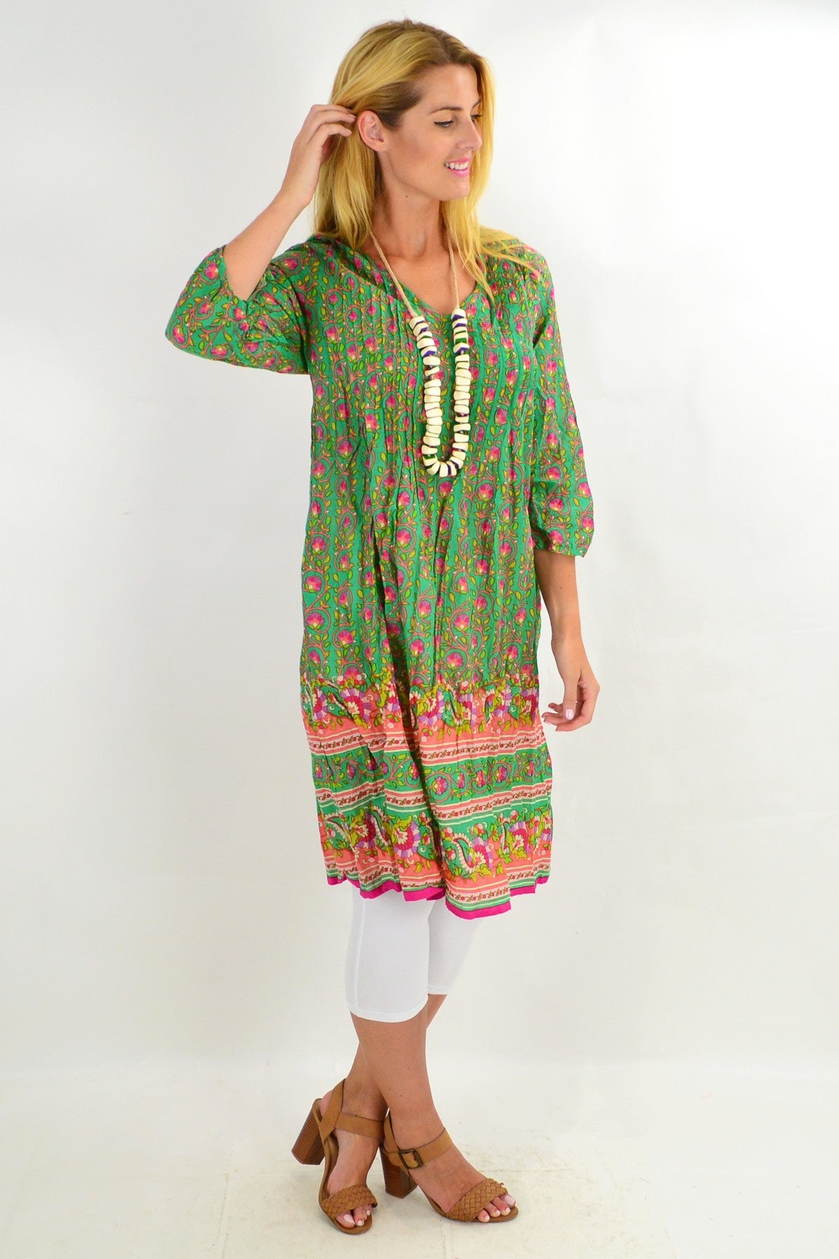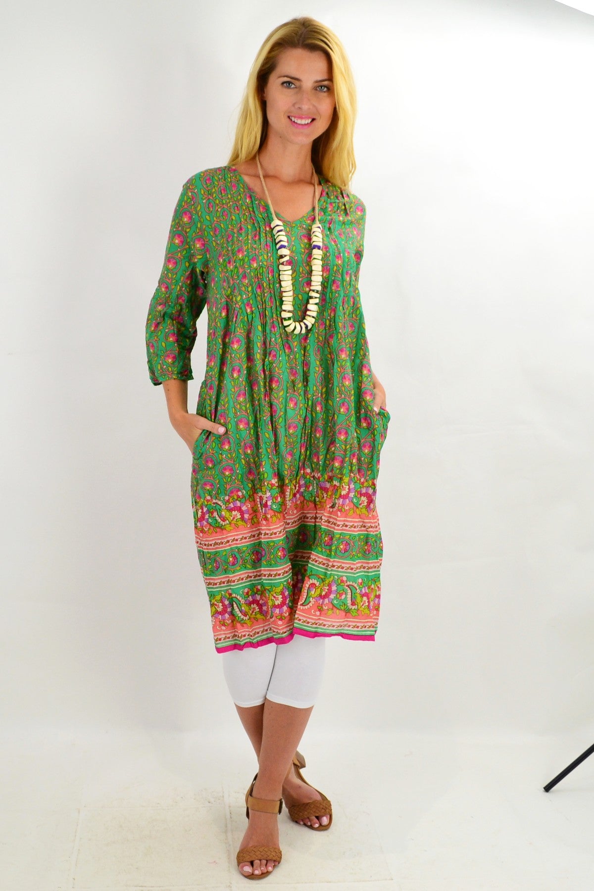 The Fire Lantern One Summer Tunic Dress is a crinkle style in a bold bright lantern and floral print that has pleats on the front and is made in a lovely soft cotton with 3/4 sleeves. Wear it to brunch with the girls, or just about anywhere really. Flats will be more casual; heels will dress up your look