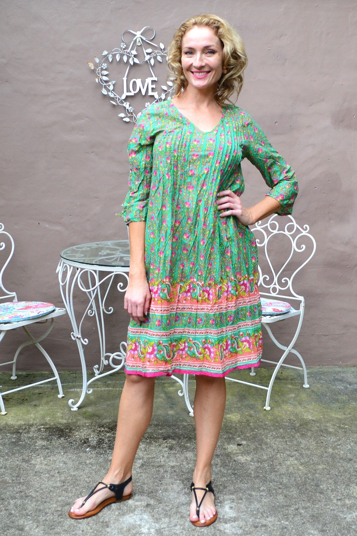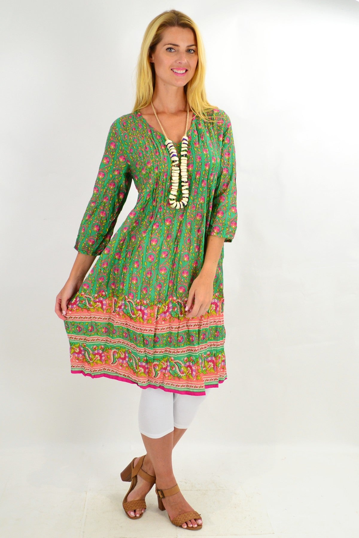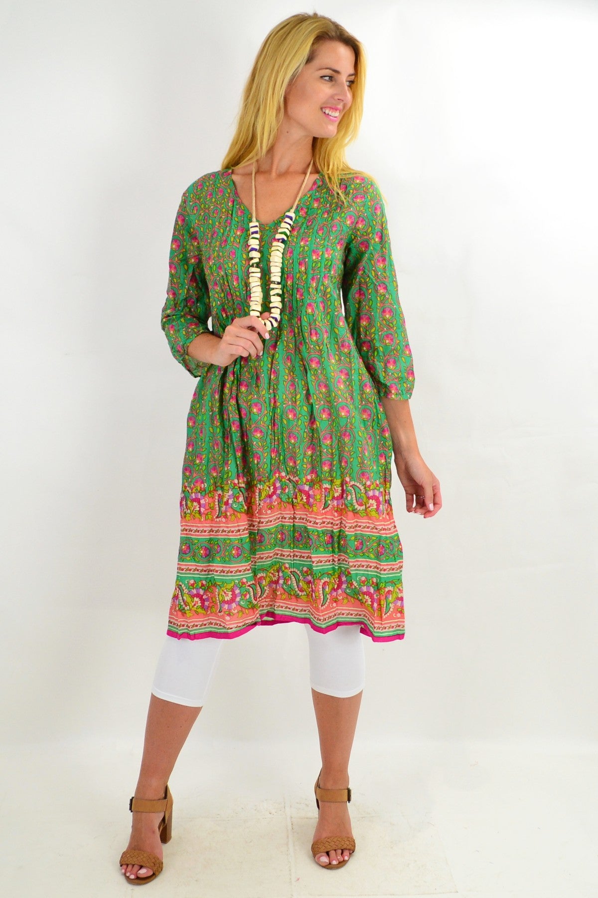 The Fire Lantern One Summer Tunic Dress is a crinkle style in a bold bright lantern and floral print that has pleats on the front and is made in a lovely soft cotton with 3/4 sleeves. Wear it to brunch with the girls, or just about anywhere really. Flats will be more casual; heels will dress up your look