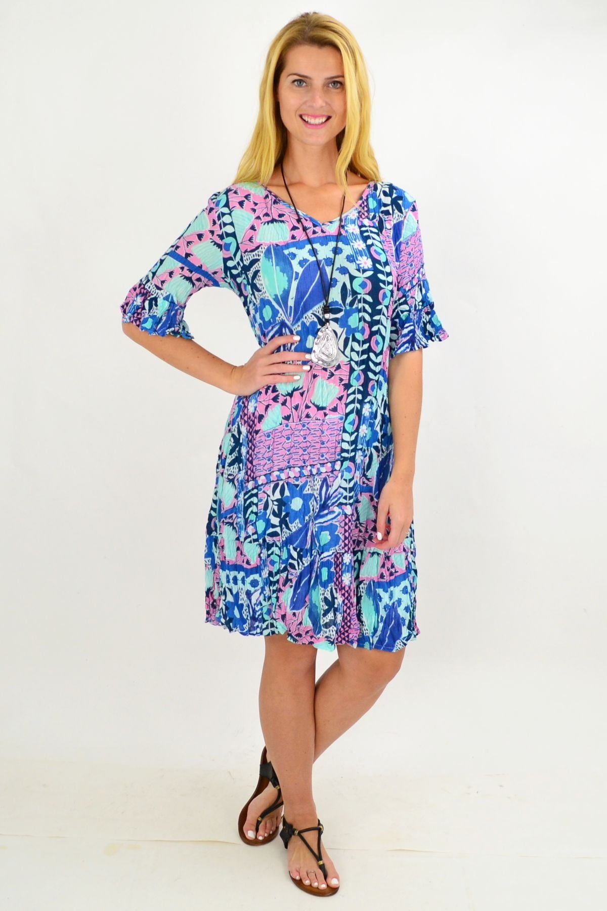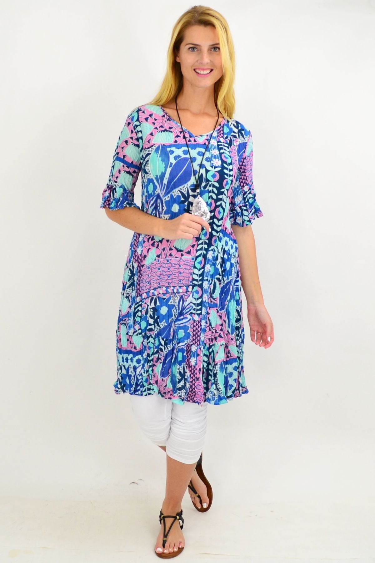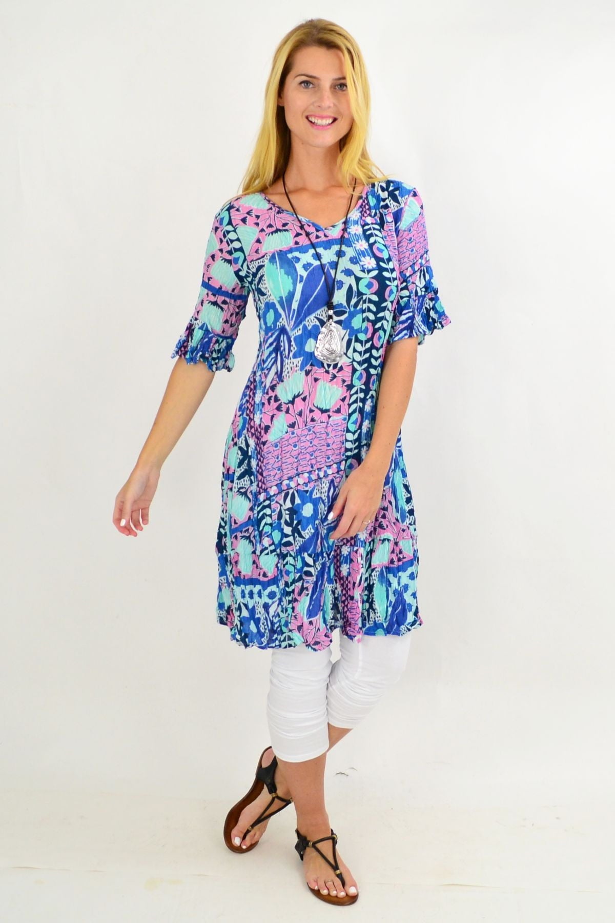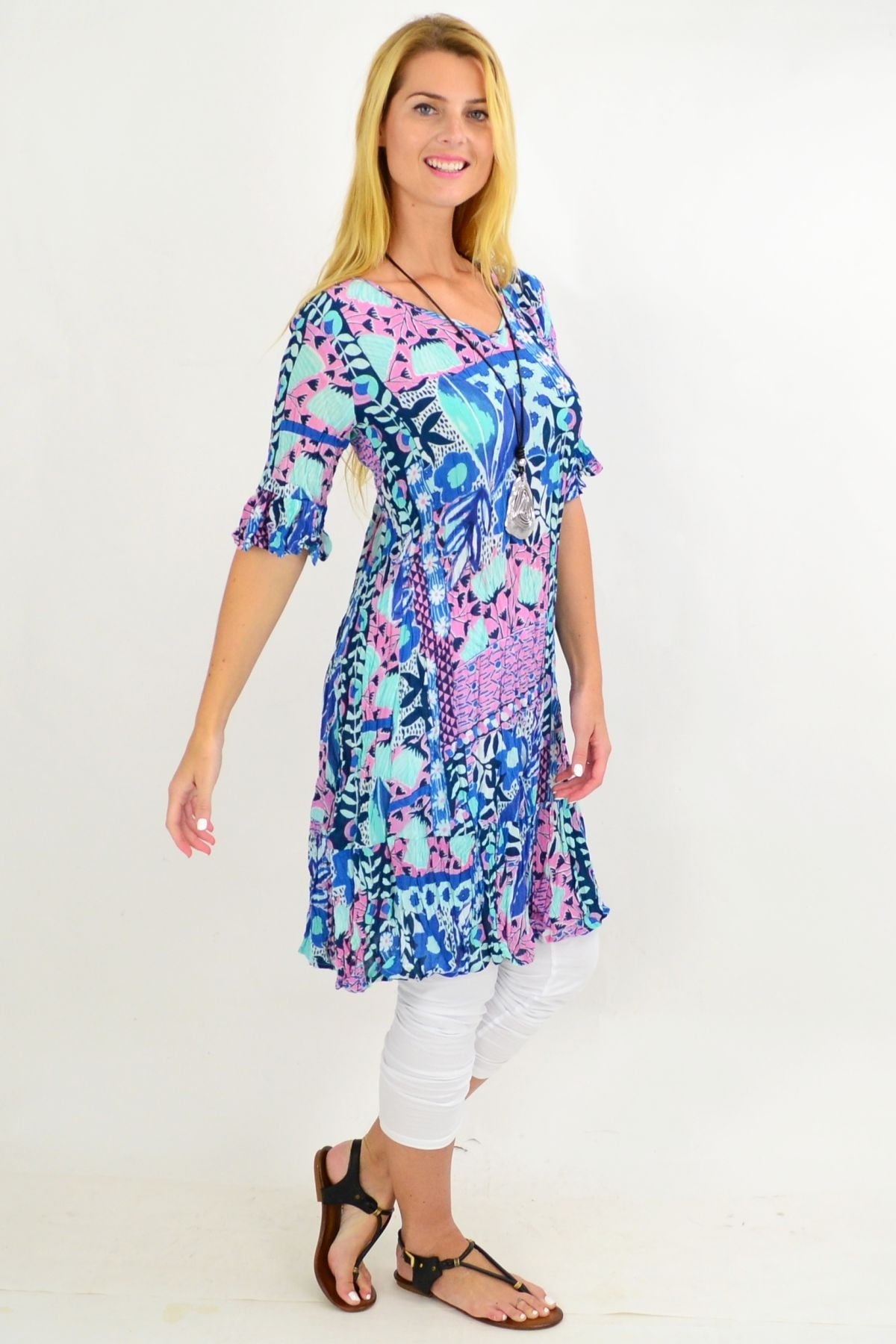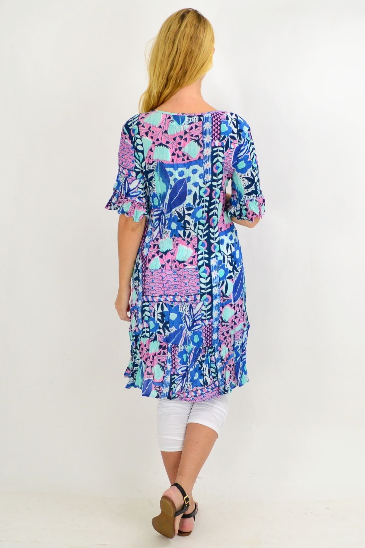 Crafted from a crinkle rayon fabric, this playful shift dress features a V neck with ruffle cuffs and hem. Be sure to check out our 3/4 white legging that will compliment this beautiful tunic and complete your look this summer