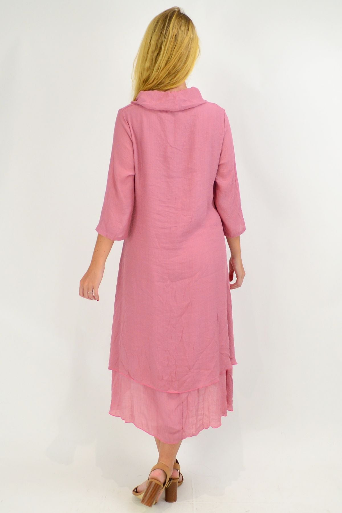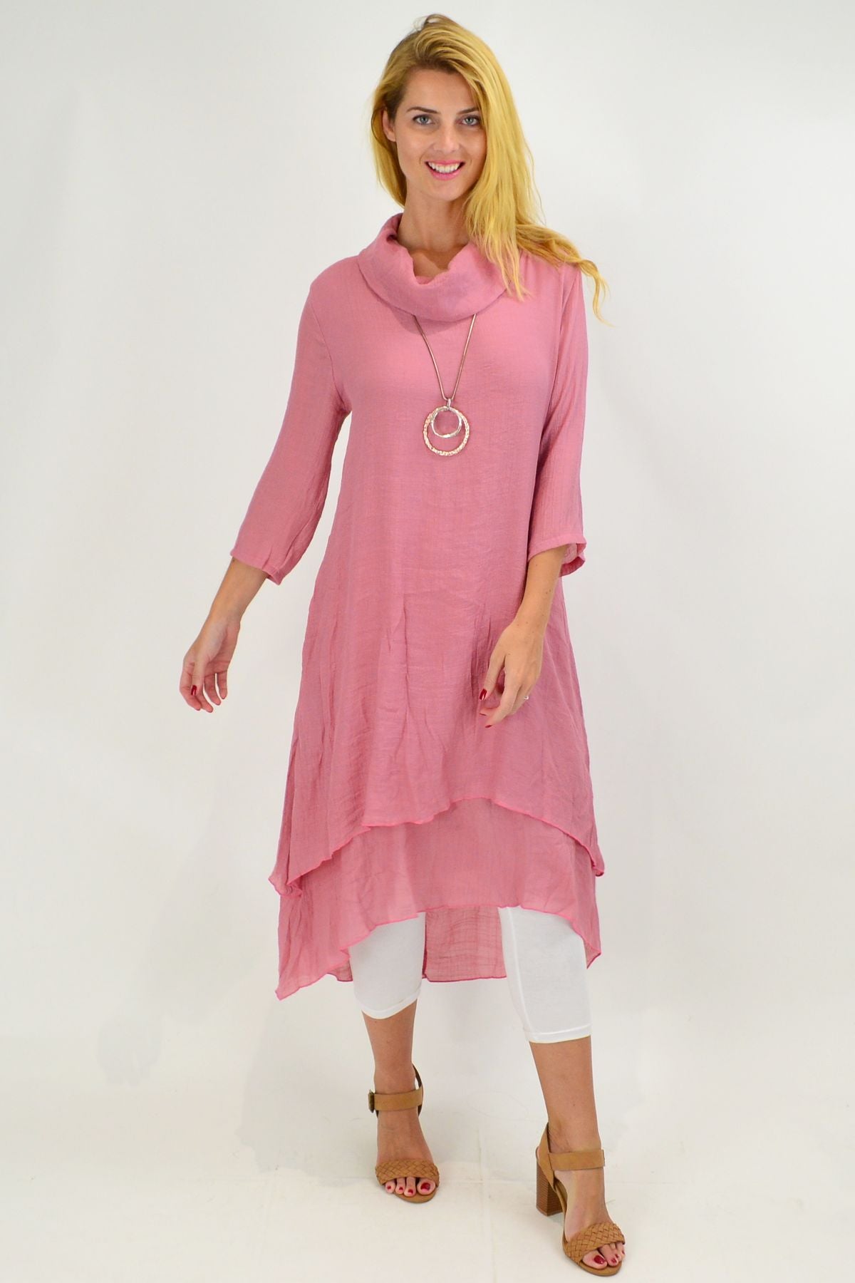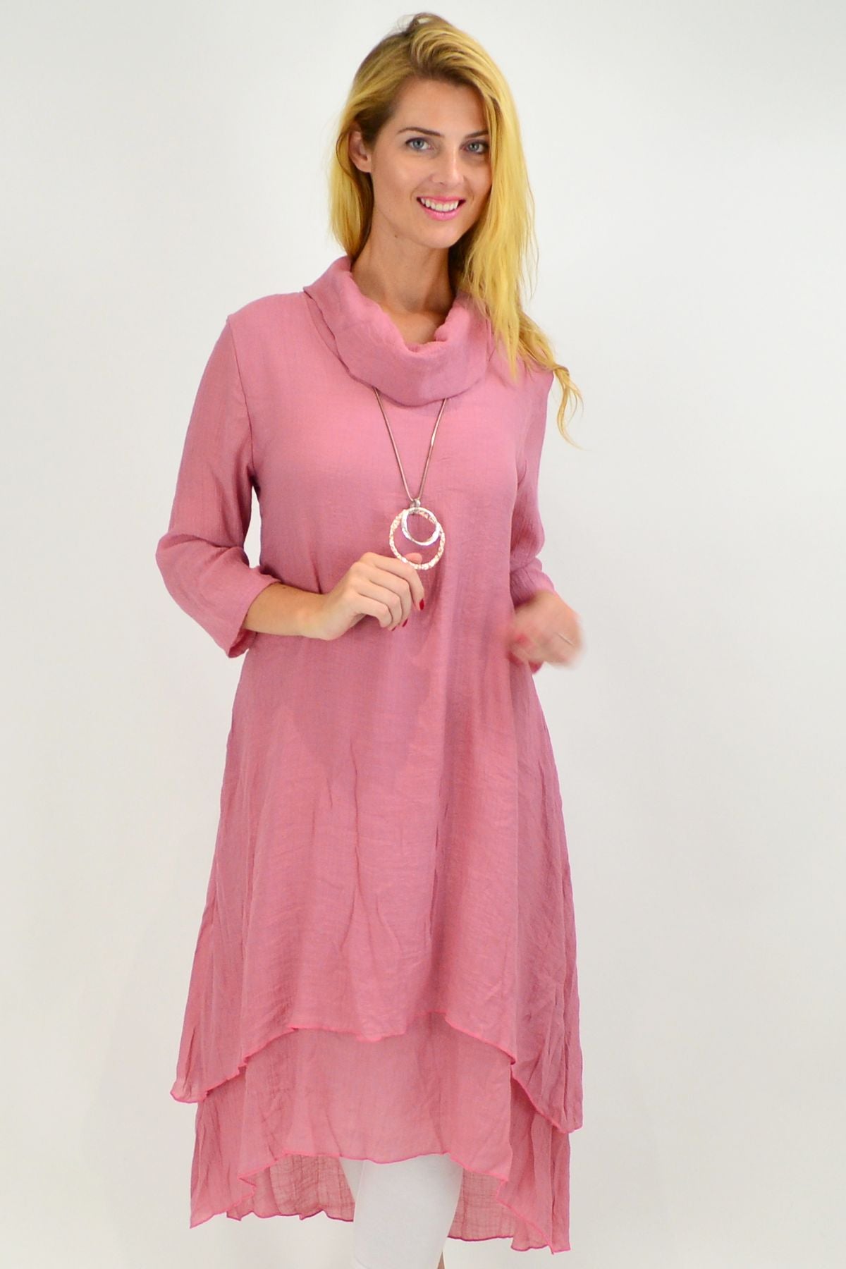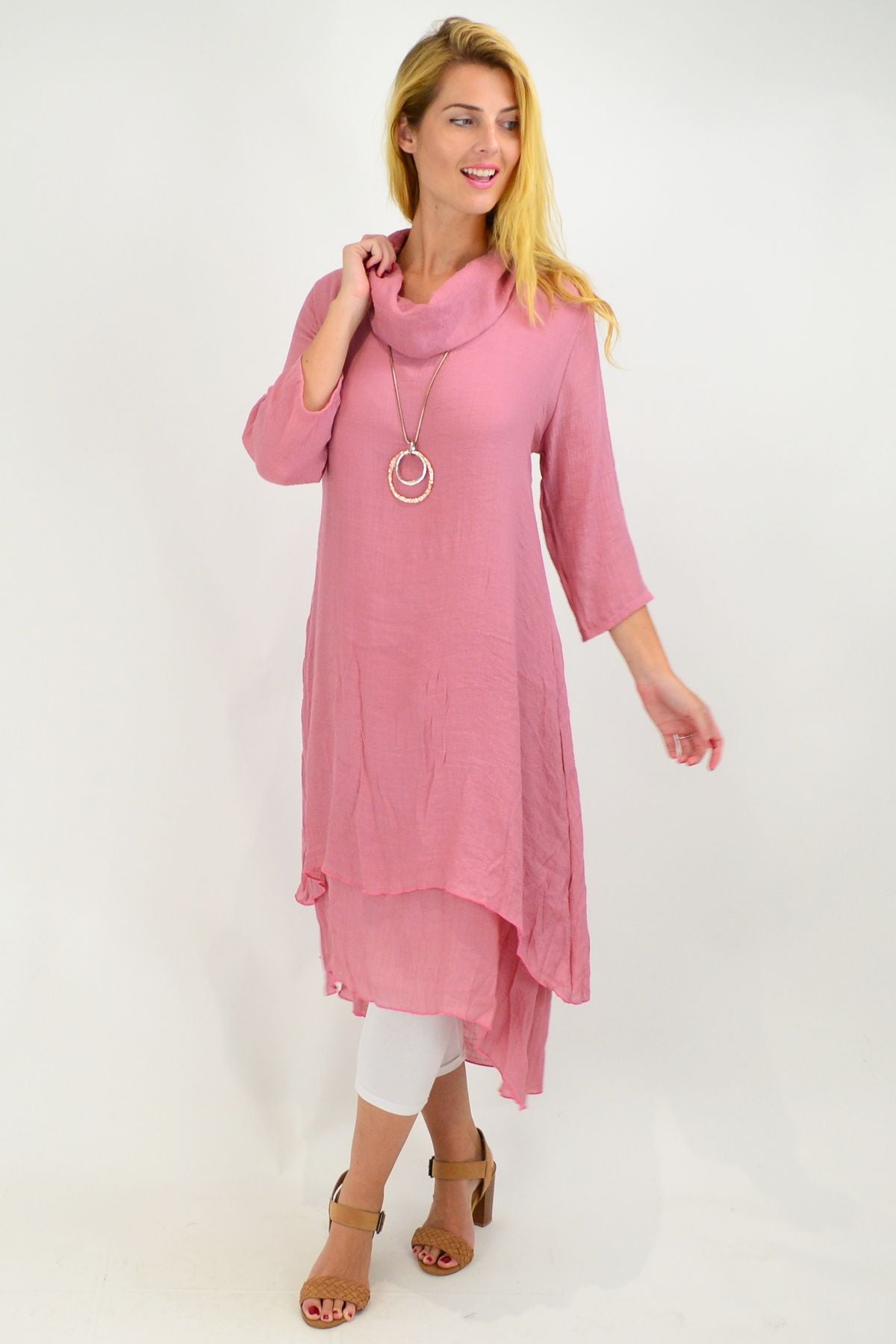 Regular price $69.99This stylish Dusty Pink Cowl Neck Tunic Dress is in a lightweight design and lovely for hot days. The soft woven cotton linen fabric has been layered and draped for a flattering, sculptural silhouette with loose folds that move elegantly over the body. Cut in a cowl neck with 3/4 sleeves and a double layered hi low hem. Perfect over leggings or wear as a dress with a sun hat and sandals