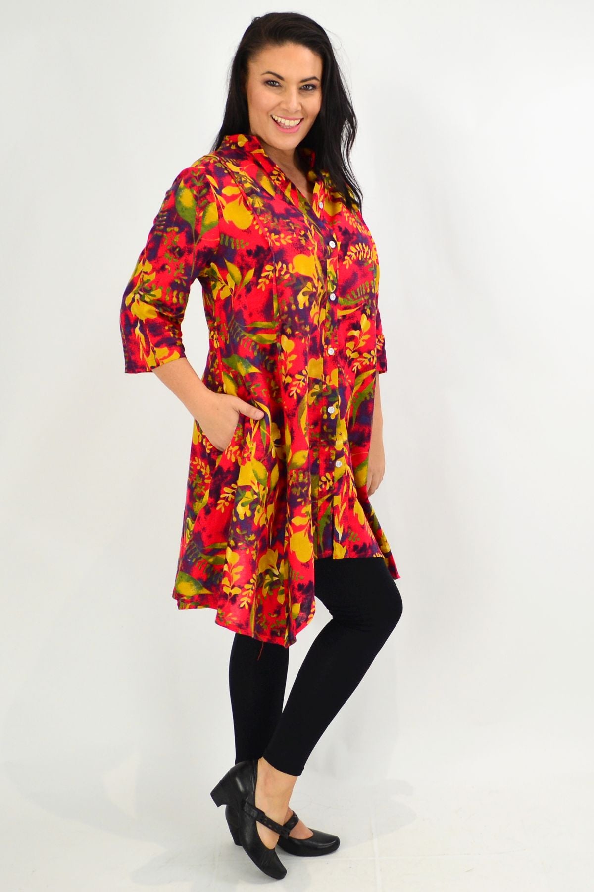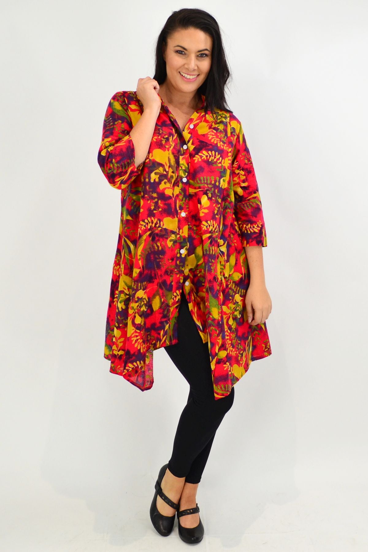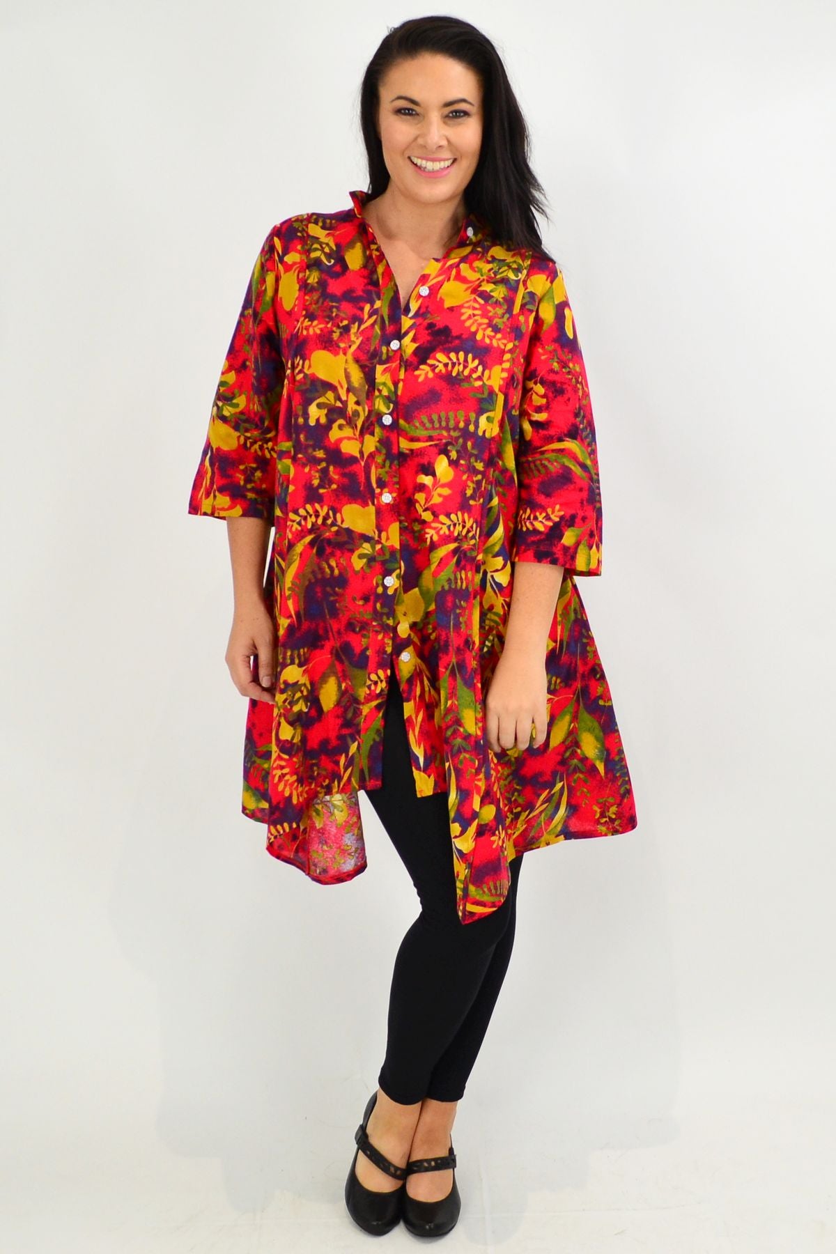 Regular price $59.99The Autumn Leaves Stand Collar Long Shirt is made in a woven cotton fabric with a stand collar, 3/4 sleeves in a A line cut and is perfect for the turn of the season. Match with leggings and flats for an everyday look