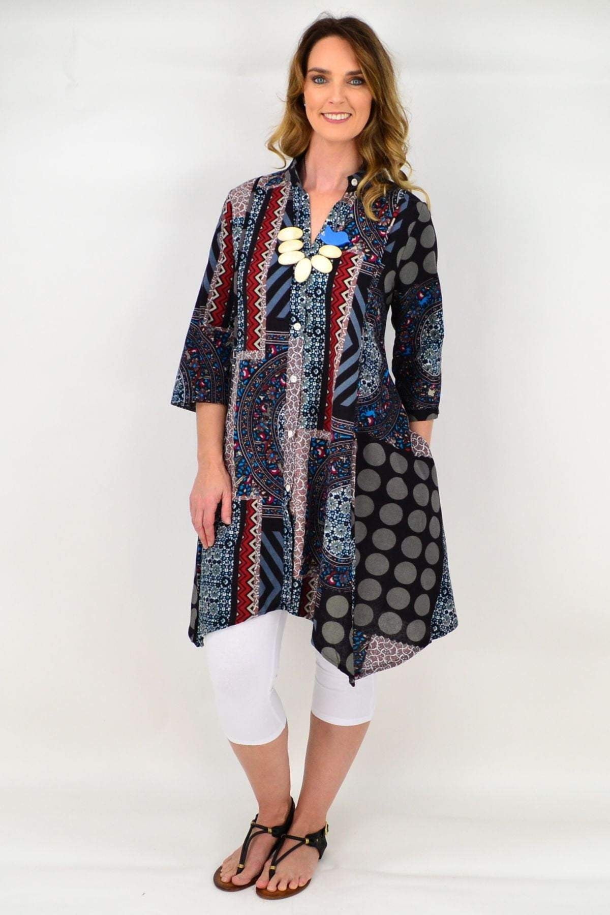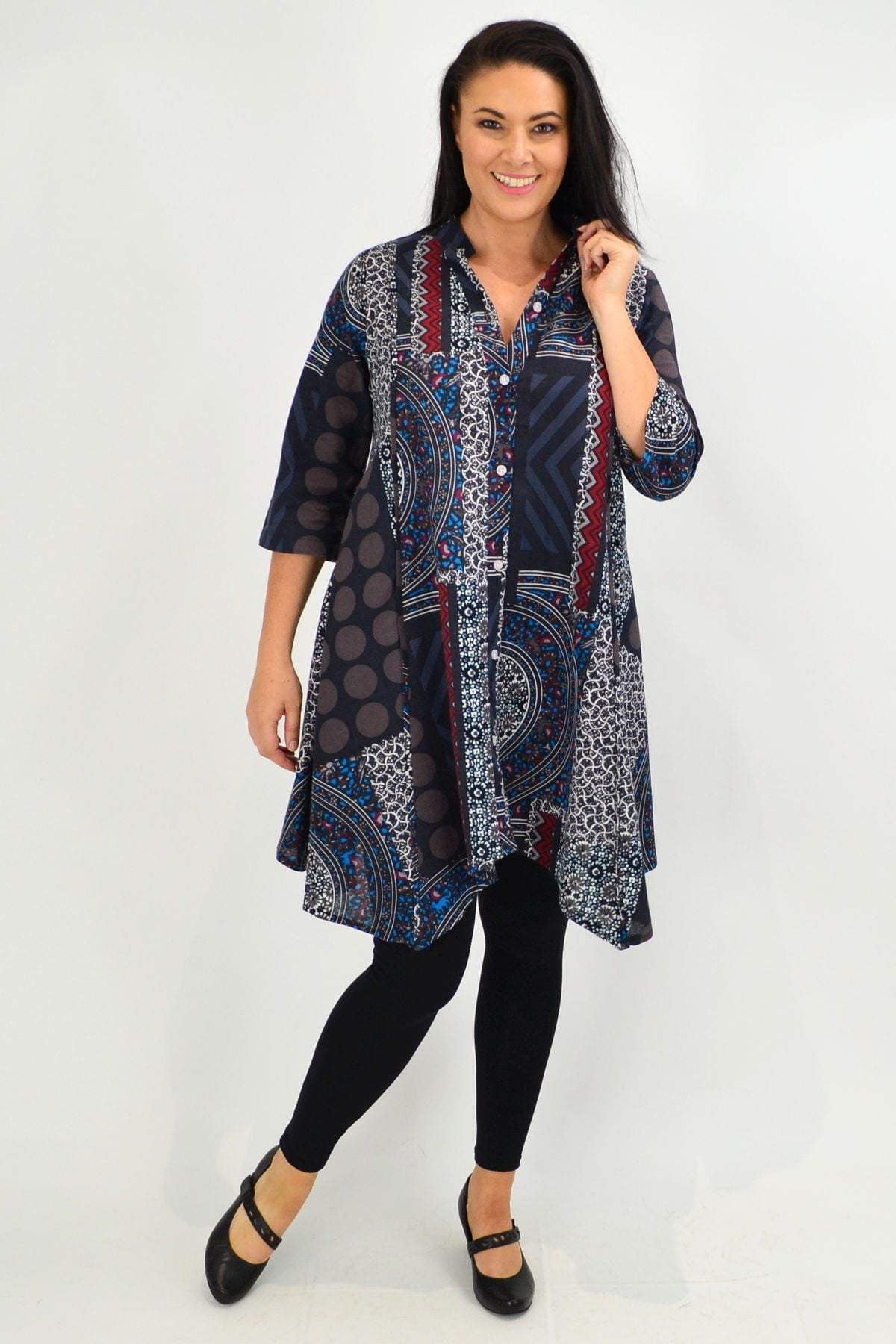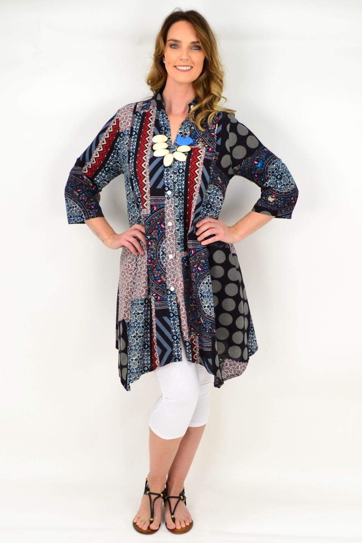 Regular price $59.99This Aztec Amaya Tunic Top is very versatile and easy to wear. It can be worn open or closes and is made in a thicker cotton in a relaxed A line shape, with 3/4 sleeves and hideaway side pleats. Team with 3/4 capris and sandals or add leggings and boots for a fabulous look