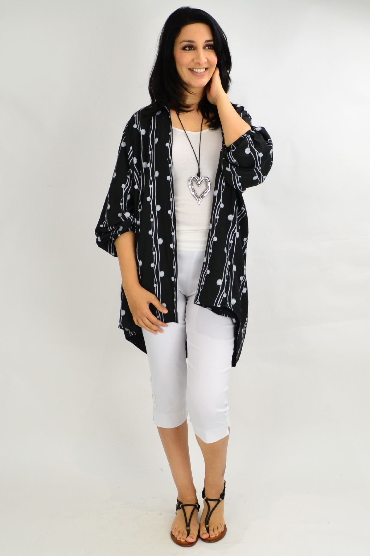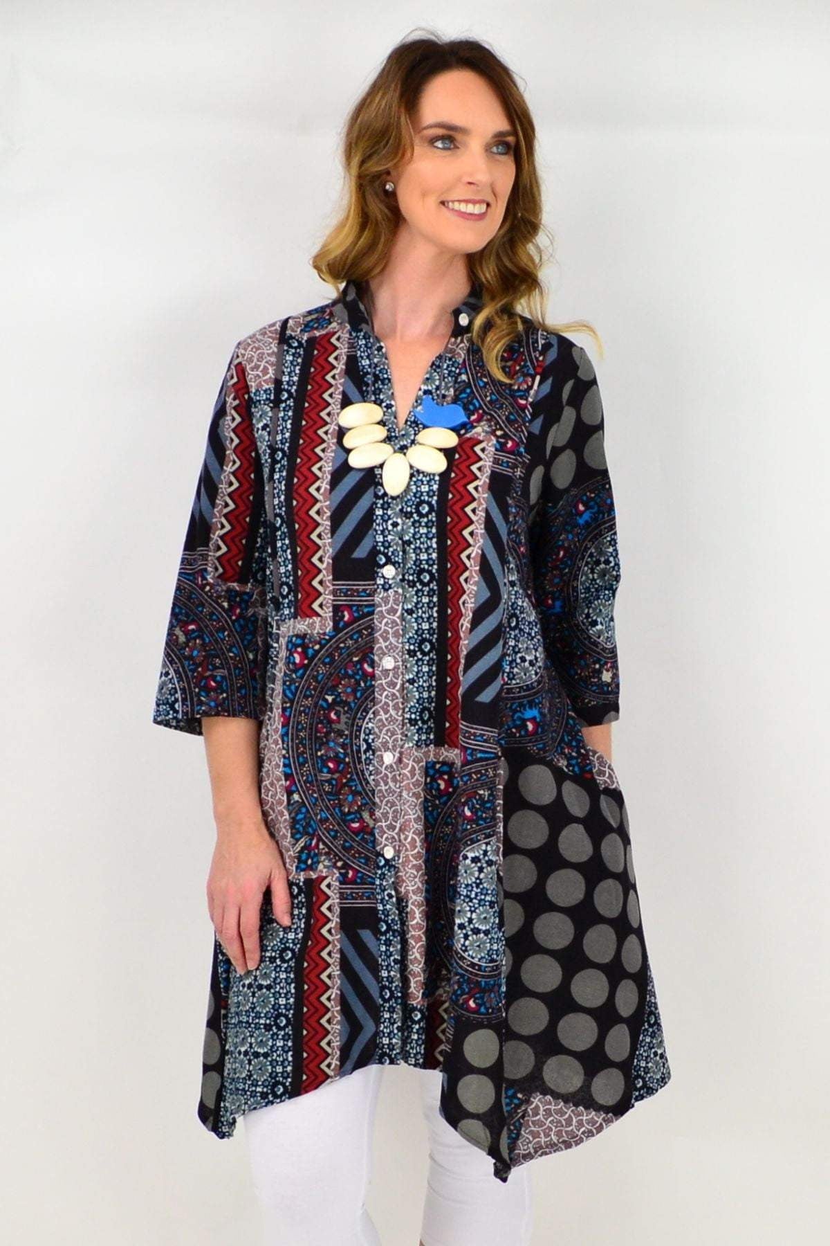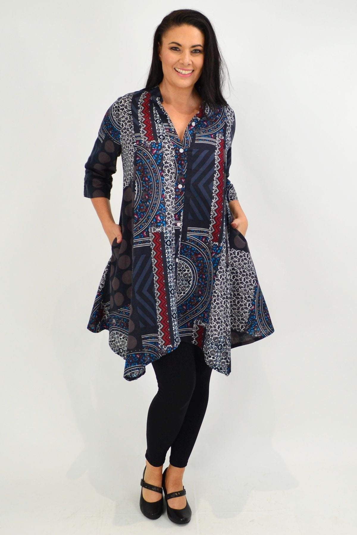 Regular price $59.99This Aztec Amaya Tunic Top is very versatile and easy to wear. It can be worn open or closes and is made in a thicker cotton in a relaxed A line shape, with 3/4 sleeves and hideaway side pleats. Team with 3/4 capris and sandals or add leggings and boots for a fabulous look
