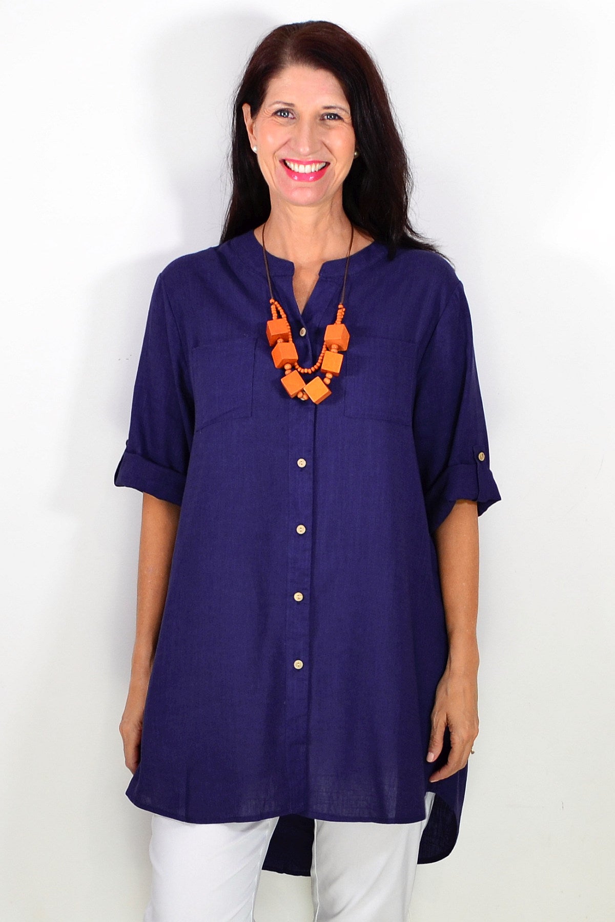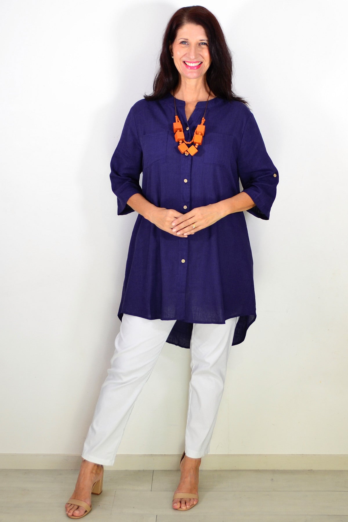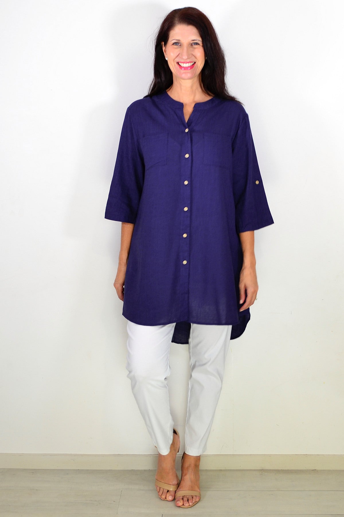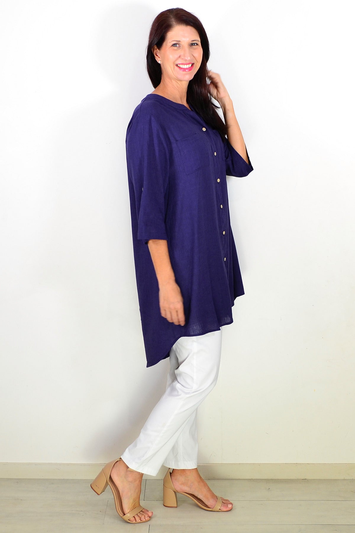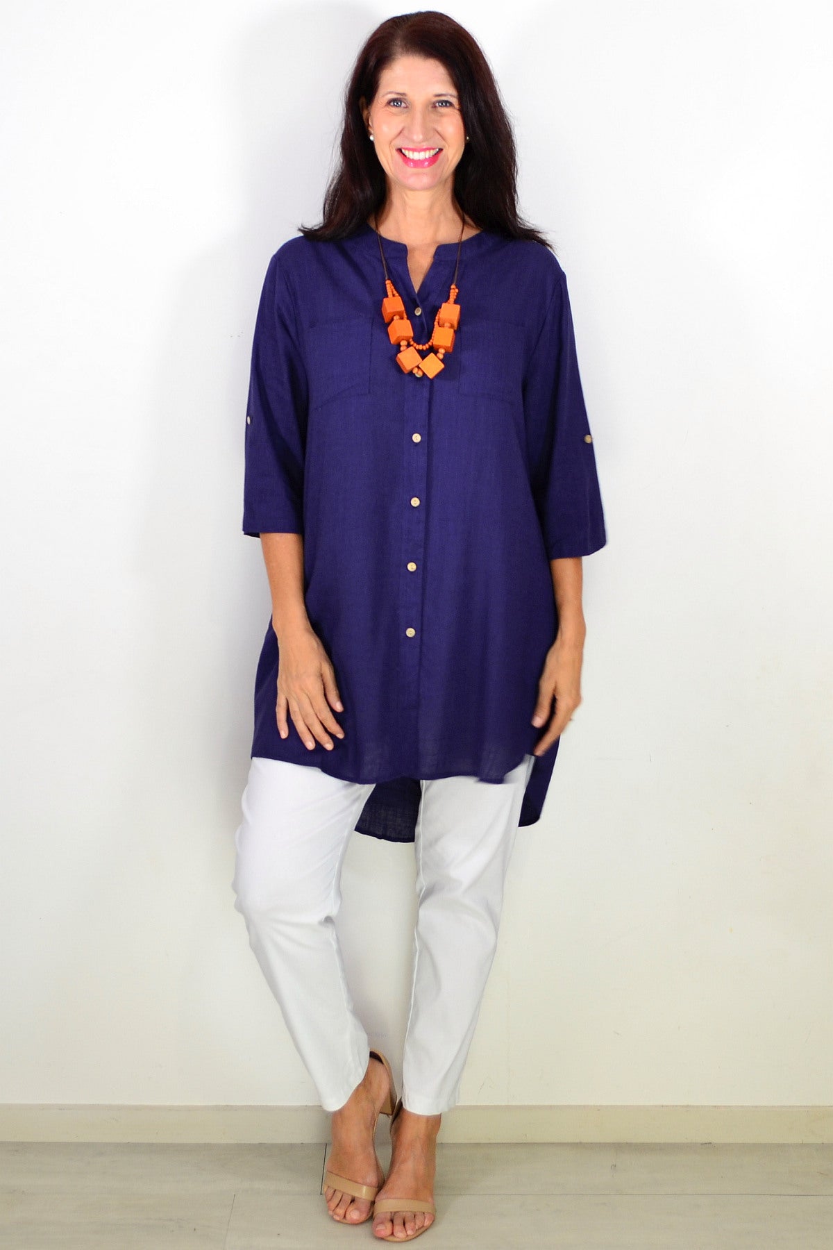 Elevate your everyday wardrobe with the Relaxed Navy Blue Hi-Low Tunic Shirt. Made from a soft, premium linen cotton blend, it offers medium-weight comfort and effortless style. Featuring 3/4 button-up sleeves with loop fastening, a V-neckline, and a flattering hi-low hem that falls below the hips. This tunic is perfect for layering- wear it open over a singlet or buttoned for a polished look. Ideal for casual outings, work, or travel, this tunic combines comfort, versatility, and timeless style in one essential piece.