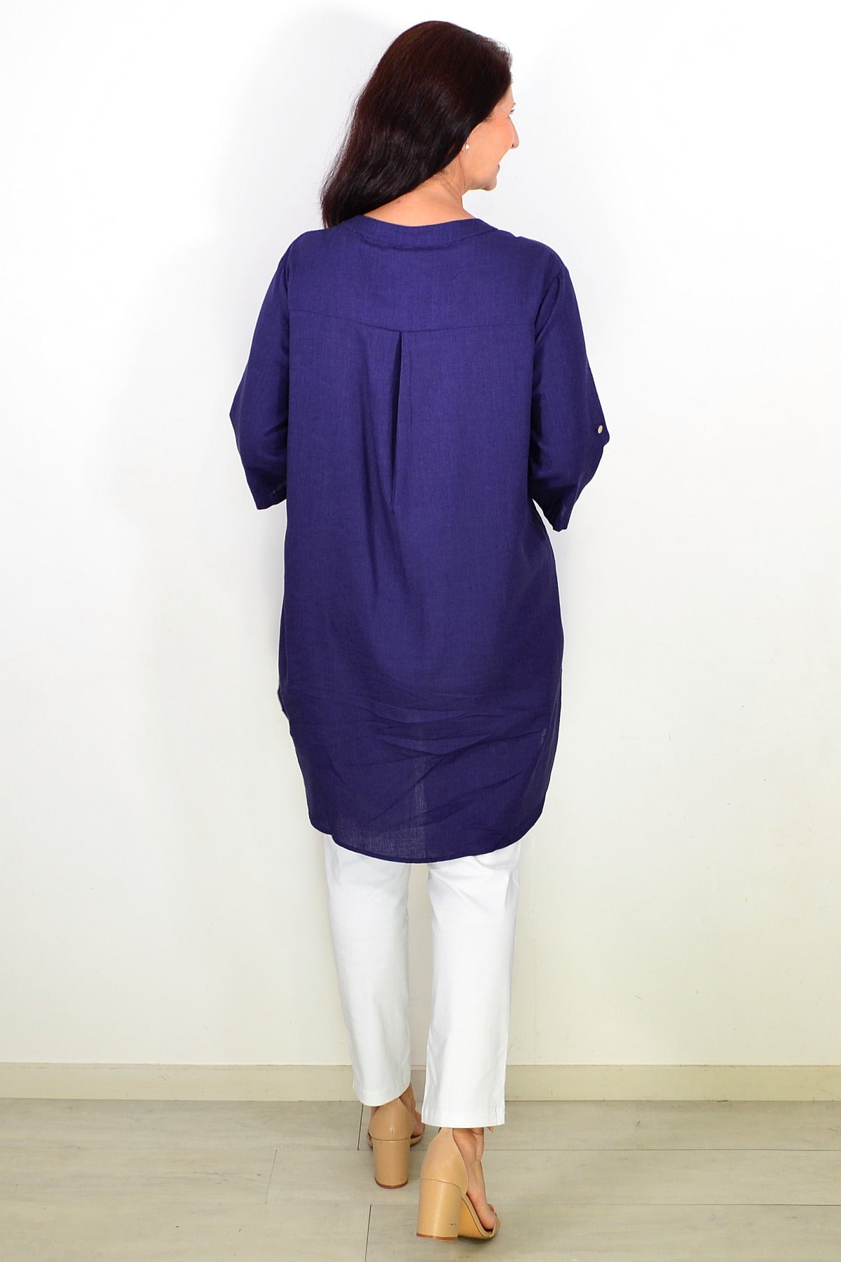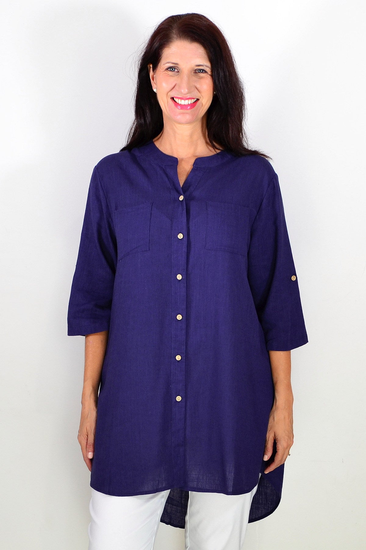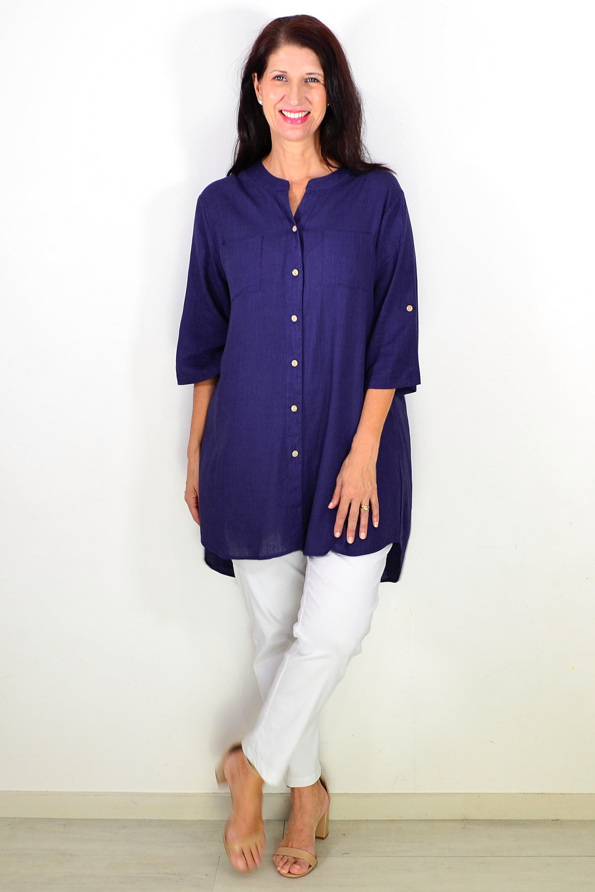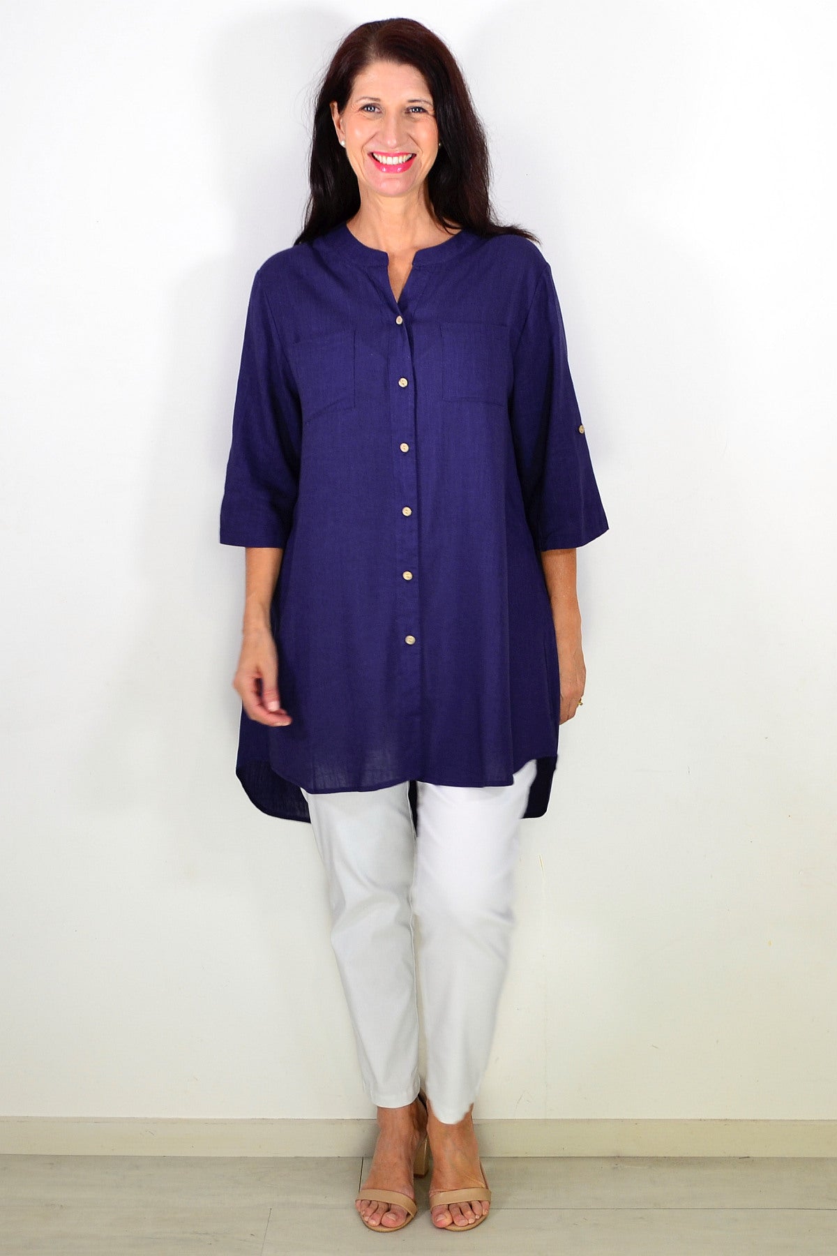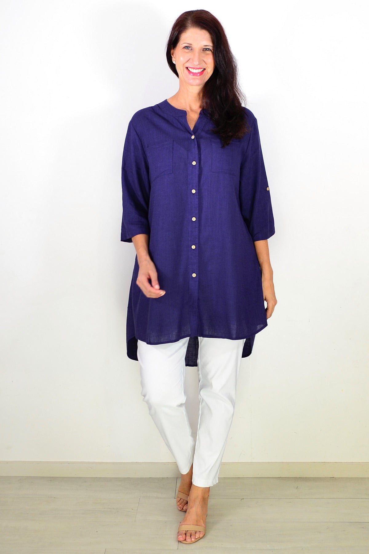 Elevate your everyday wardrobe with the Relaxed Navy Blue Hi-Low Tunic Shirt. Made from a soft, premium linen cotton blend, it offers medium-weight comfort and effortless style. Featuring 3/4 button-up sleeves with loop fastening, a V-neckline, and a flattering hi-low hem that falls below the hips. This tunic is perfect for layering- wear it open over a singlet or buttoned for a polished look. Ideal for casual outings, work, or travel, this tunic combines comfort, versatility, and timeless style in one essential piece.