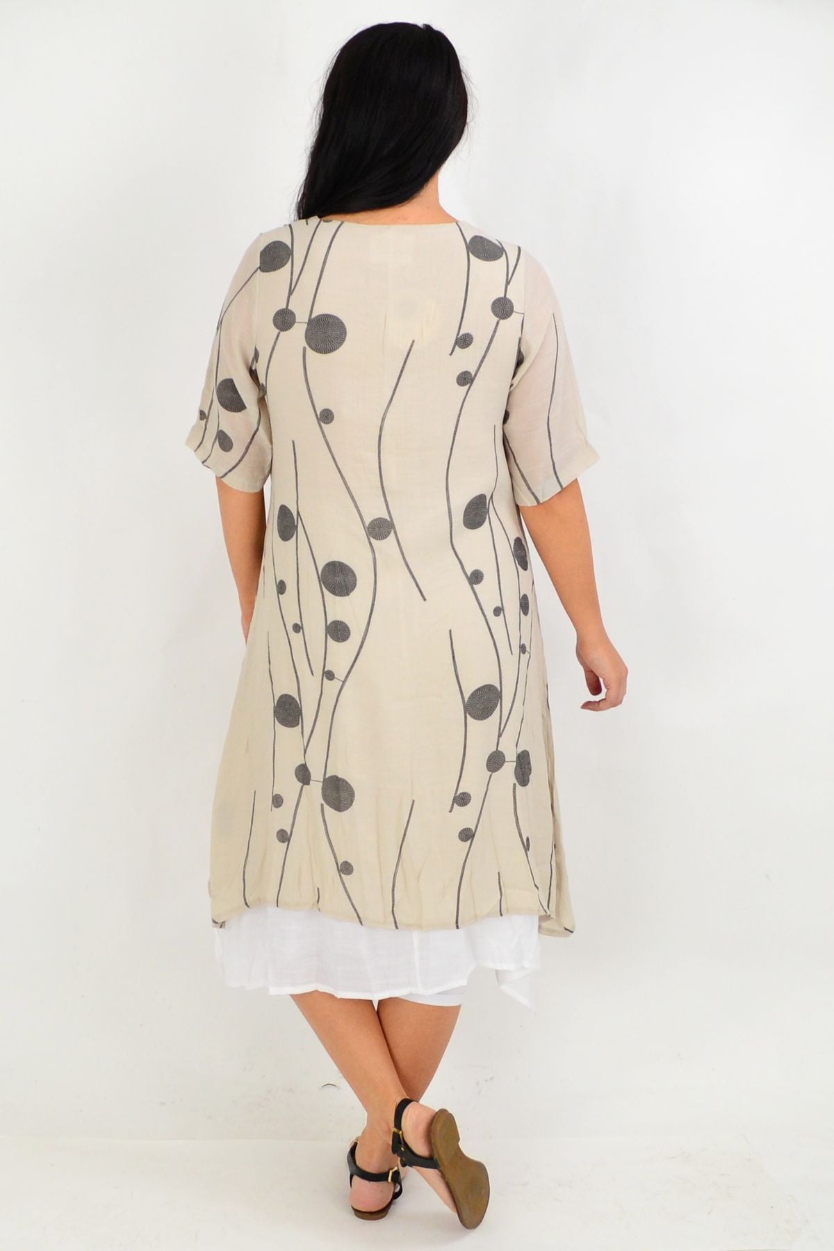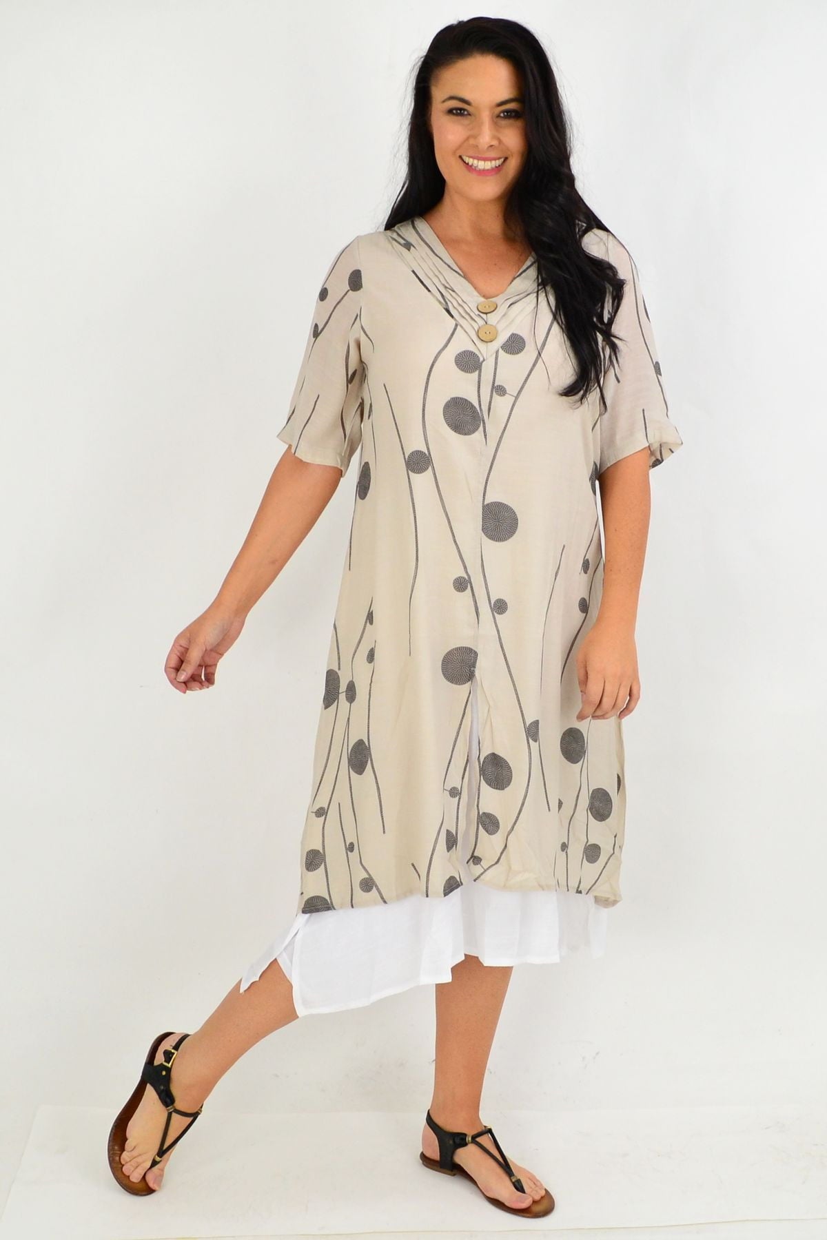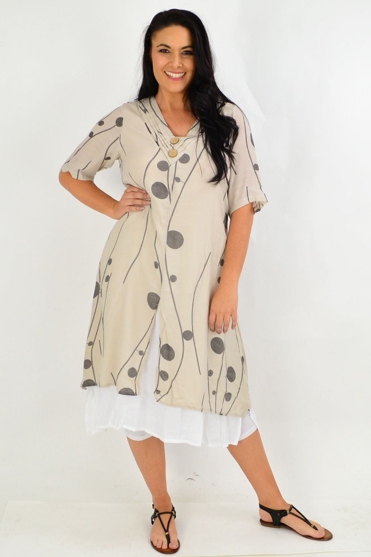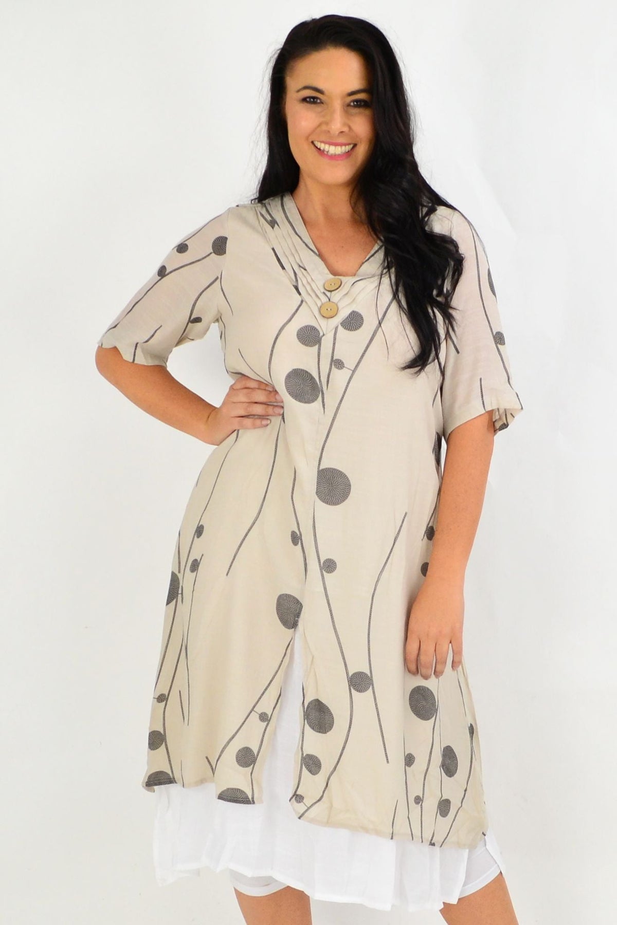 Regular price $59.99This Taupe Line Dot Overlay Tunic Dress is the perfect start to spring. It is made in a woven fabric that falls easily over the body, with short sleeves, V neck with button detail and has two layers that provide a flattering drape. Feel comfortable, relaxed and ready for a summers day when you step out in style