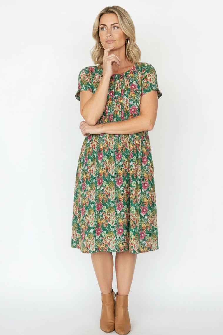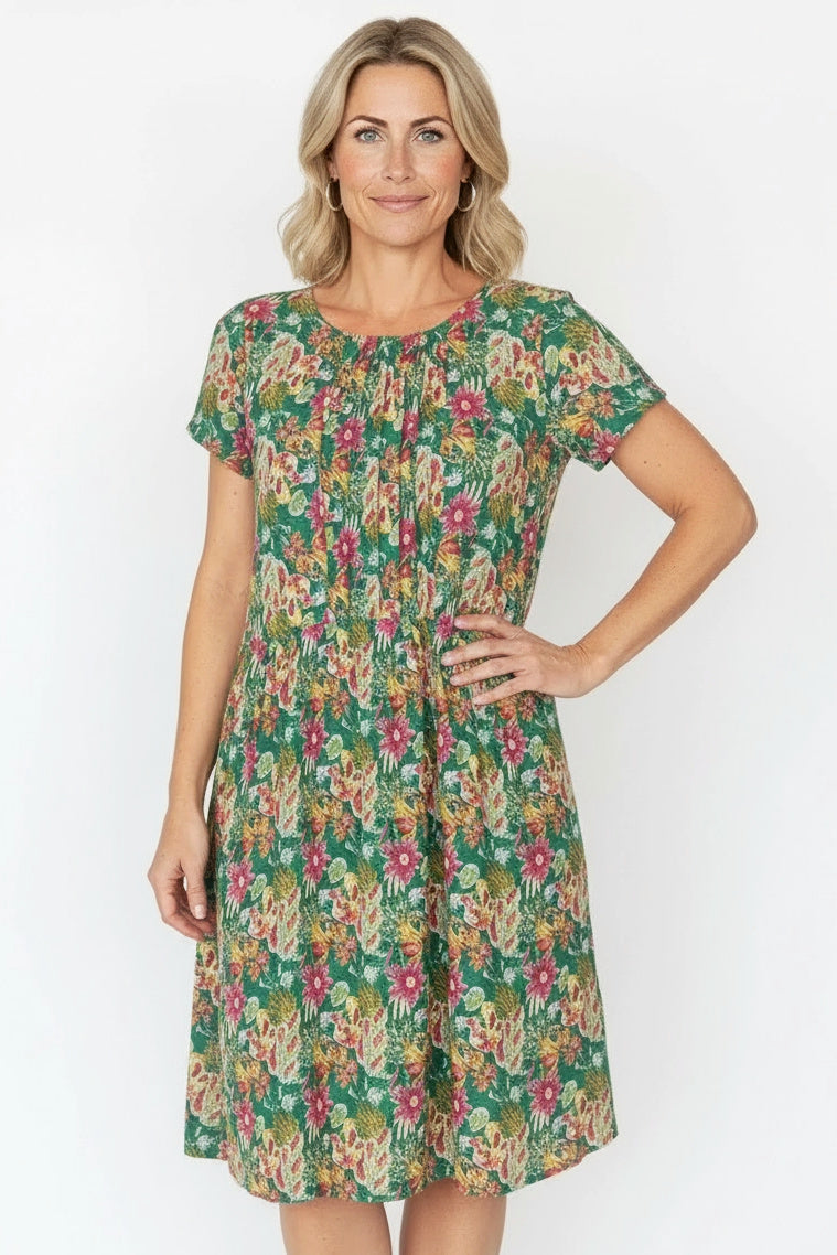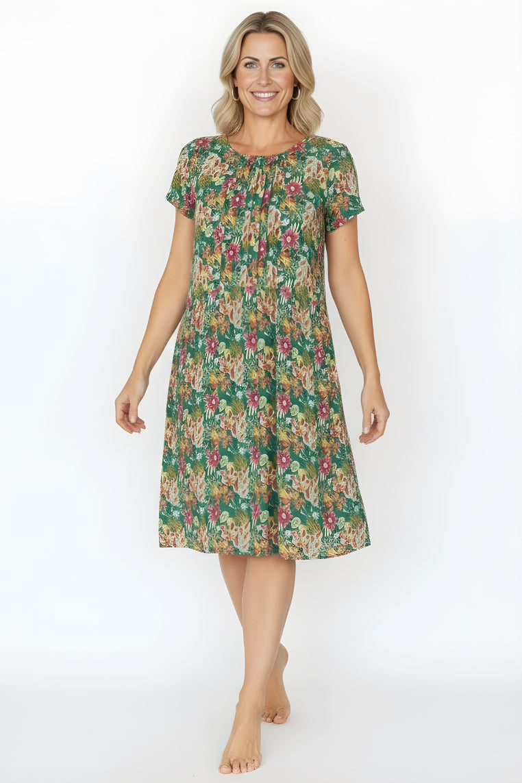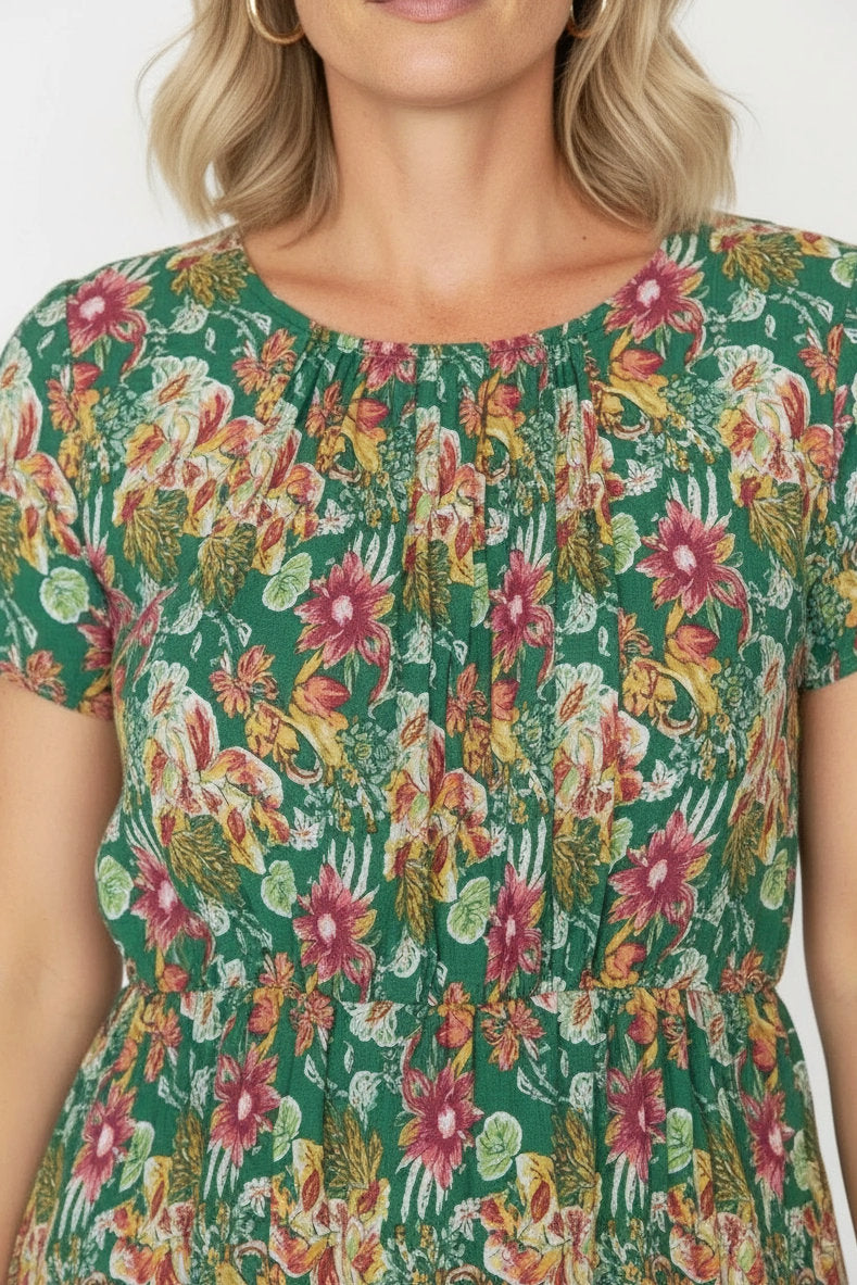 Green Floral Garden Pleated Casual Tunic Dress
