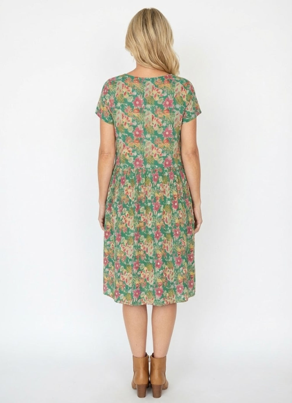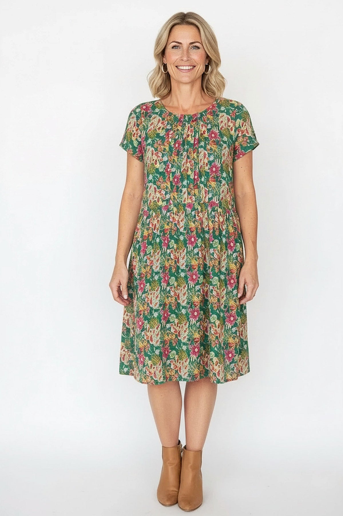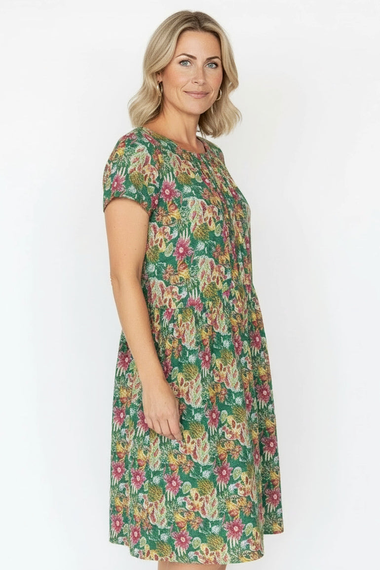 Green Floral Garden Pleated Casual Tunic Dress