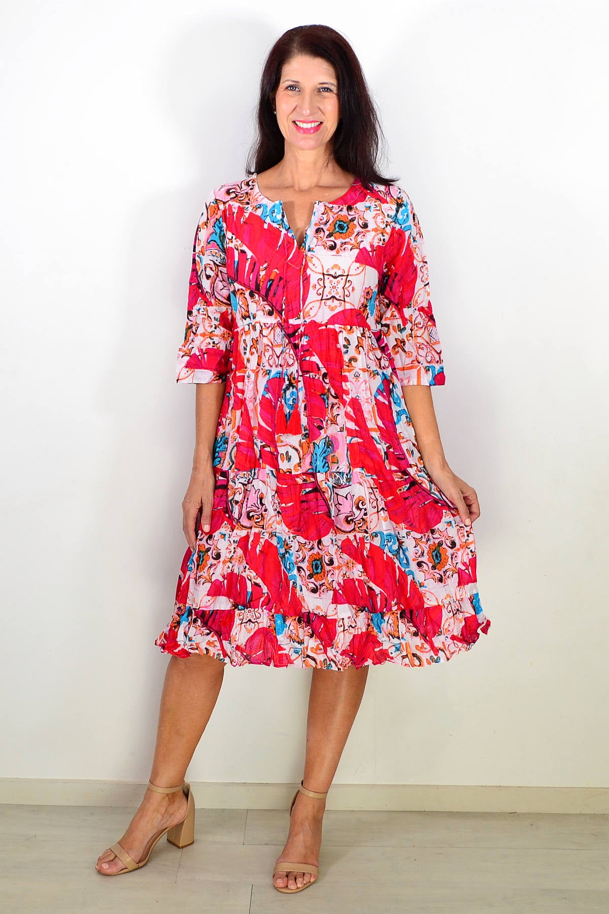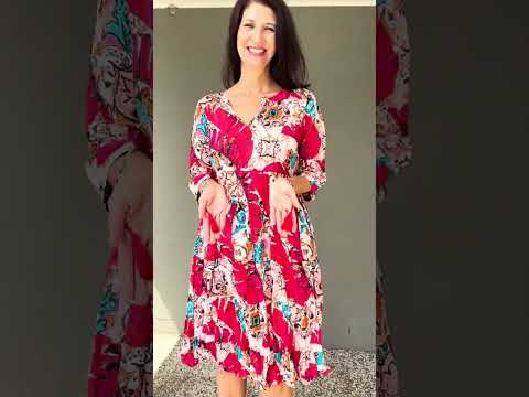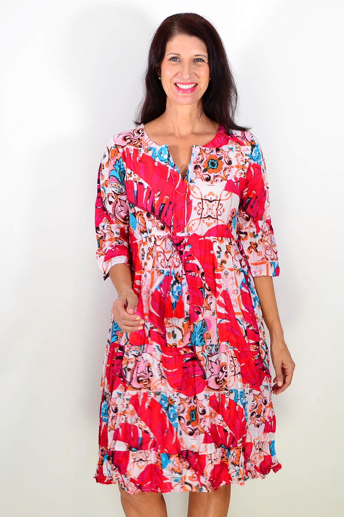 Regular price $59.99The Rebecca Pink Tie Neck Tunic Dress features soft, lightweight 100% cotton with a no-fuss crinkle texture ideal for travel. Its deep pink base is elegantly accented with vibrant blue and orange leaves in an abstract pattern that flows seamlessly front and back. Designed with a flattering A-line silhouette, 3/4 sleeves, and a round neckline with a V cut and tie, this dress offers both style and a customizable fit for effortless sophistication.